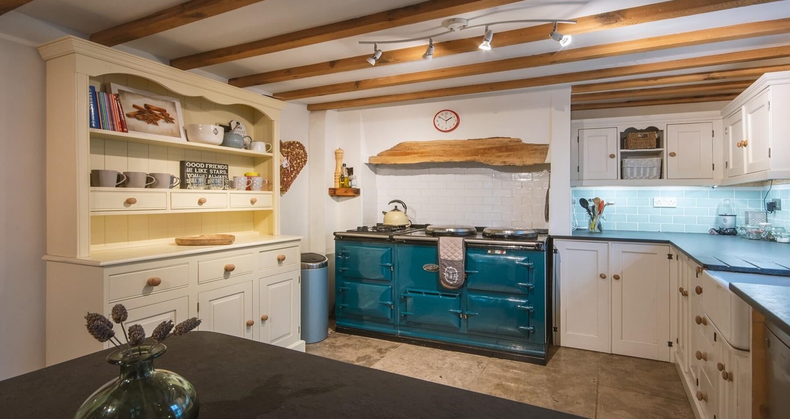 Spacious farmhouse styled with a modern twist kitchen including a shabby chic styled dining table with seating for six, AGA full sized range, microwave, Belfast sink and dishwasher. Fully equipped with plenty of cooking utensils and dishes for serving the family the tastiest culinary delights.