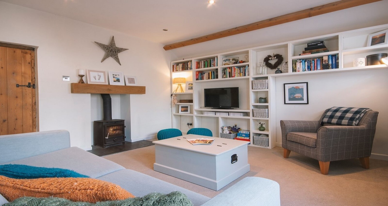 Lounge with a cosy woodburner, LCD TV with freeview and Amazon film streaming, 2 pouffe bean bags and a double sofa bed with patio doors leading out to the rear courtyard.