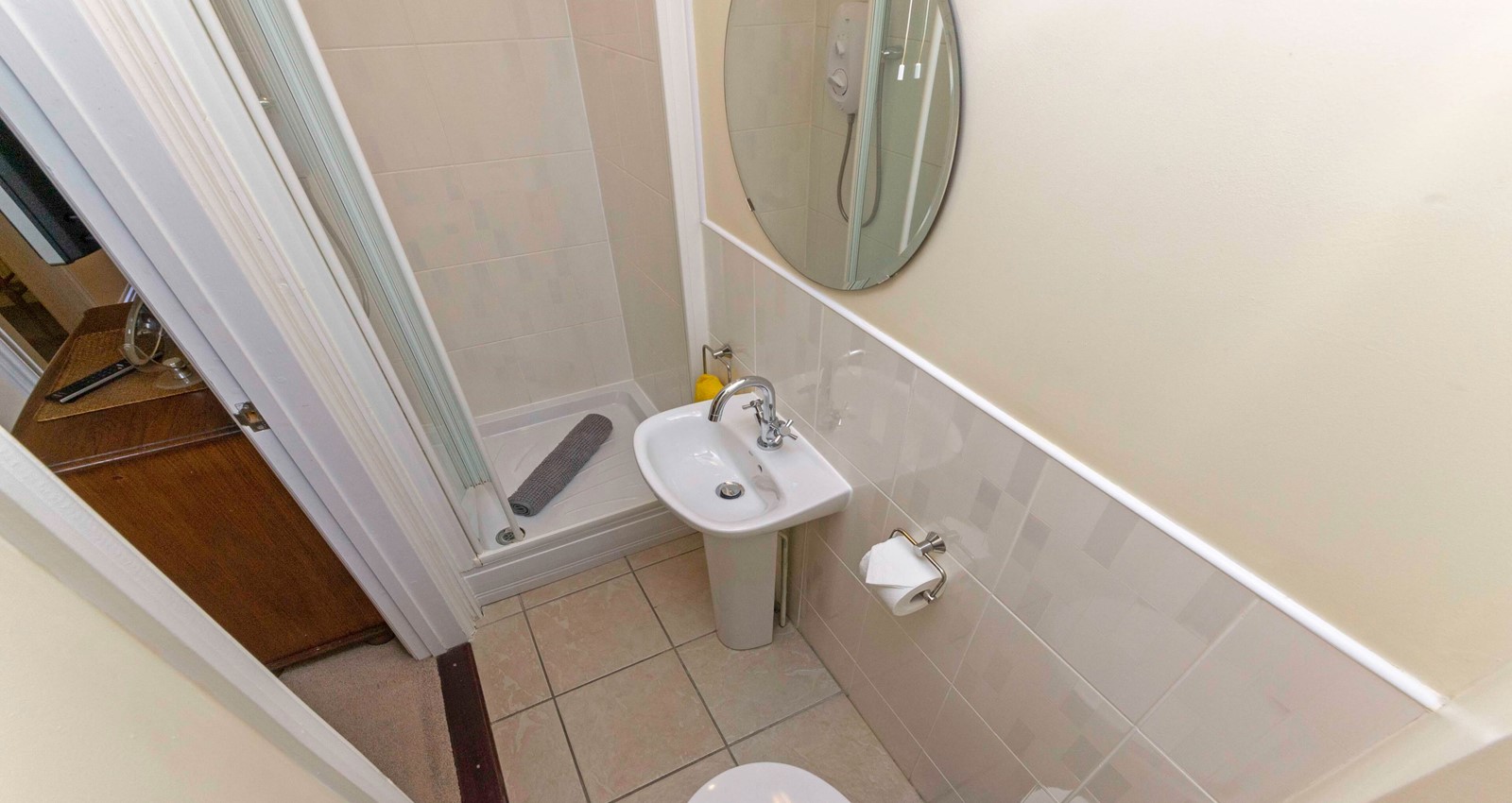 Features a bath with shower over, W.C, washbasin, mirror, and