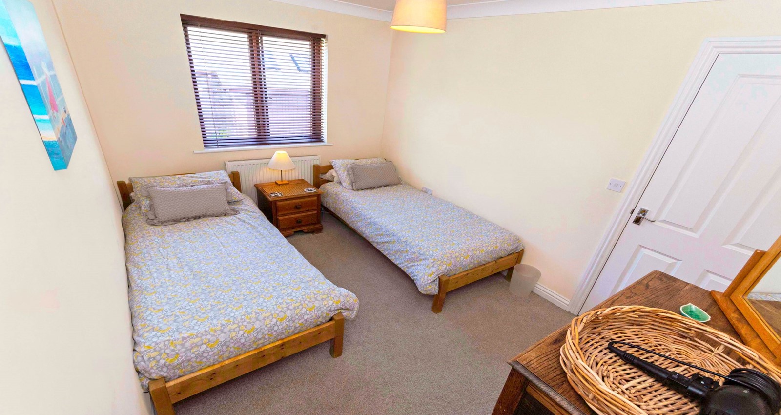 Bedroom Two: Twin beds with chest of drawers, bedside table, and hanging rail.