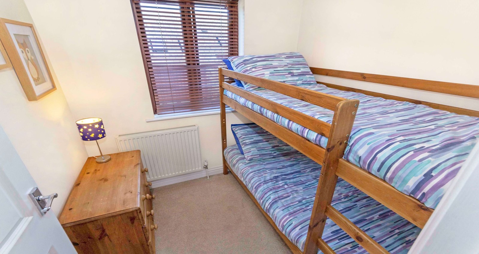Bedroom Three: Shorty bunk beds, ideal for children, with a chest of drawers and mirror.