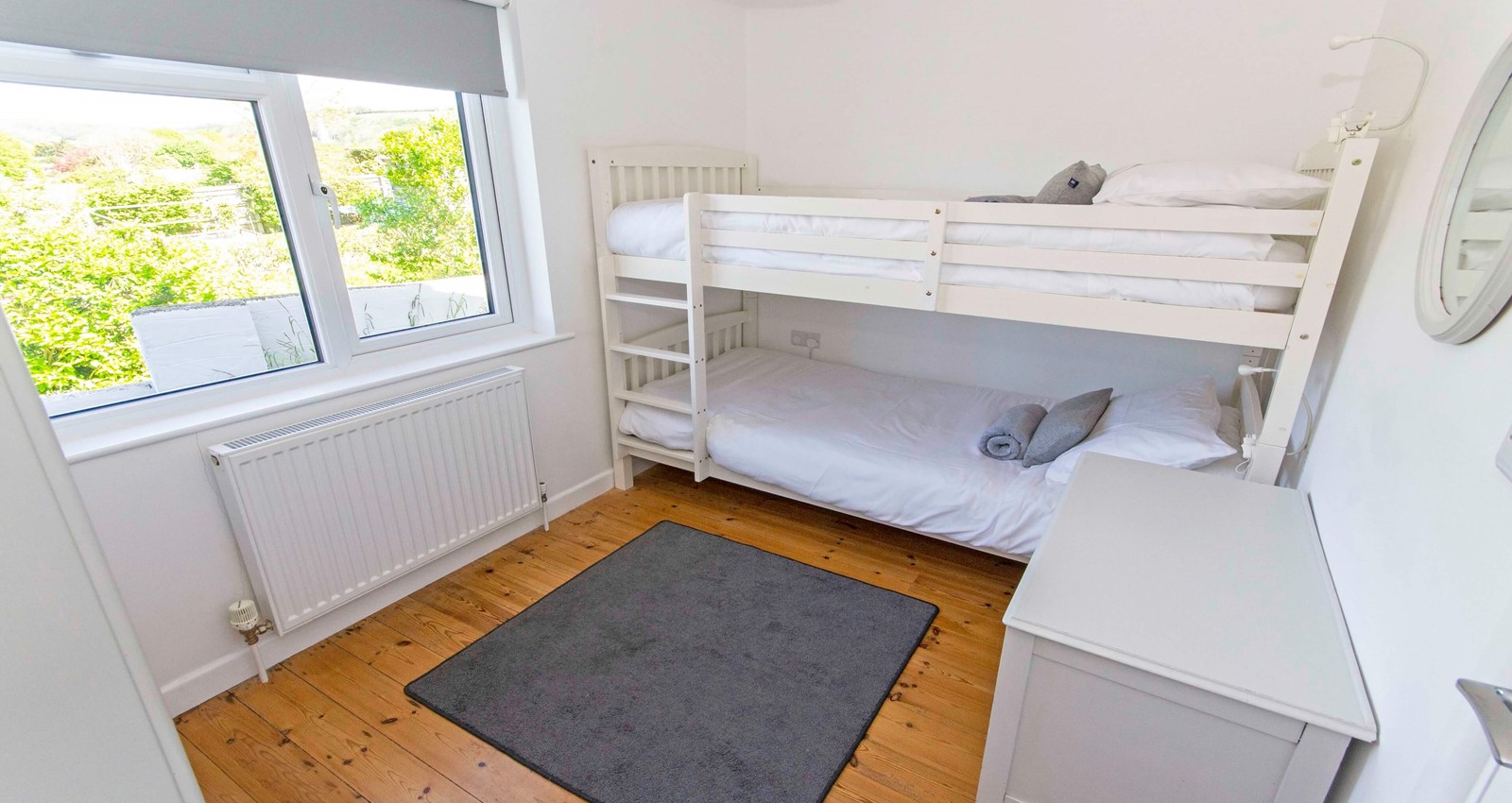 Bedroom Two: Bunk bed, bedside table, wardrobe, chest of drawers with mirror, and a chair.