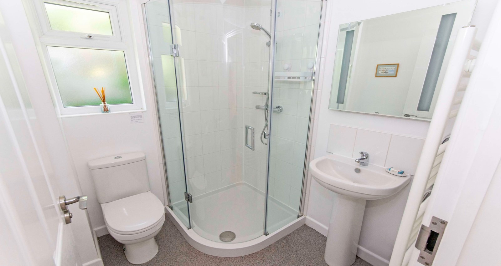 Shower with dual soaker head, W.C, washbasin with mirror and