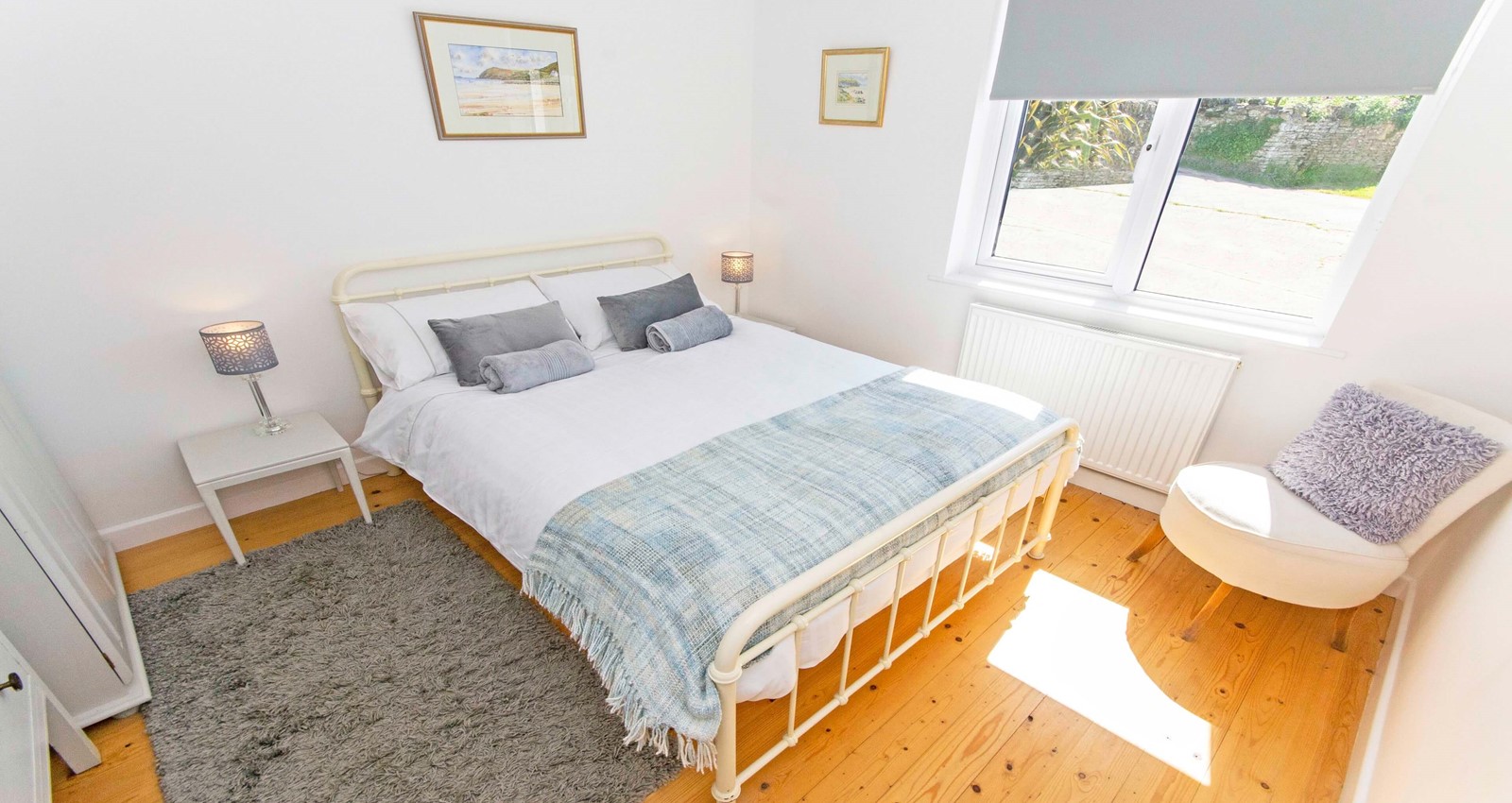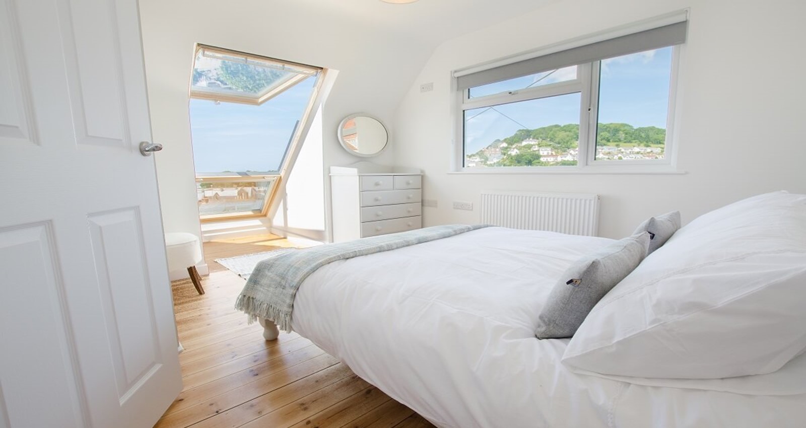Master Bedroom: Double bed, bedside tables, wardrobe, chest of drawers with mirror, and a chair. Velux balcony offers a striking viewpoint over Braunton.