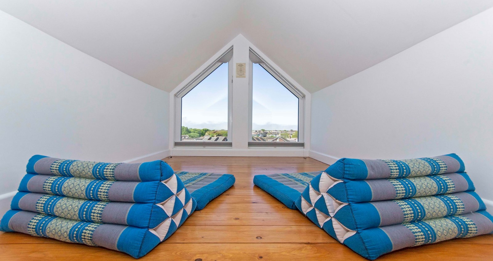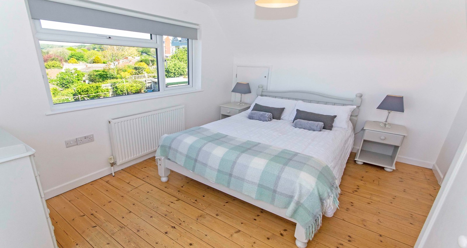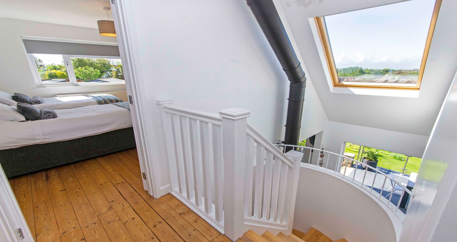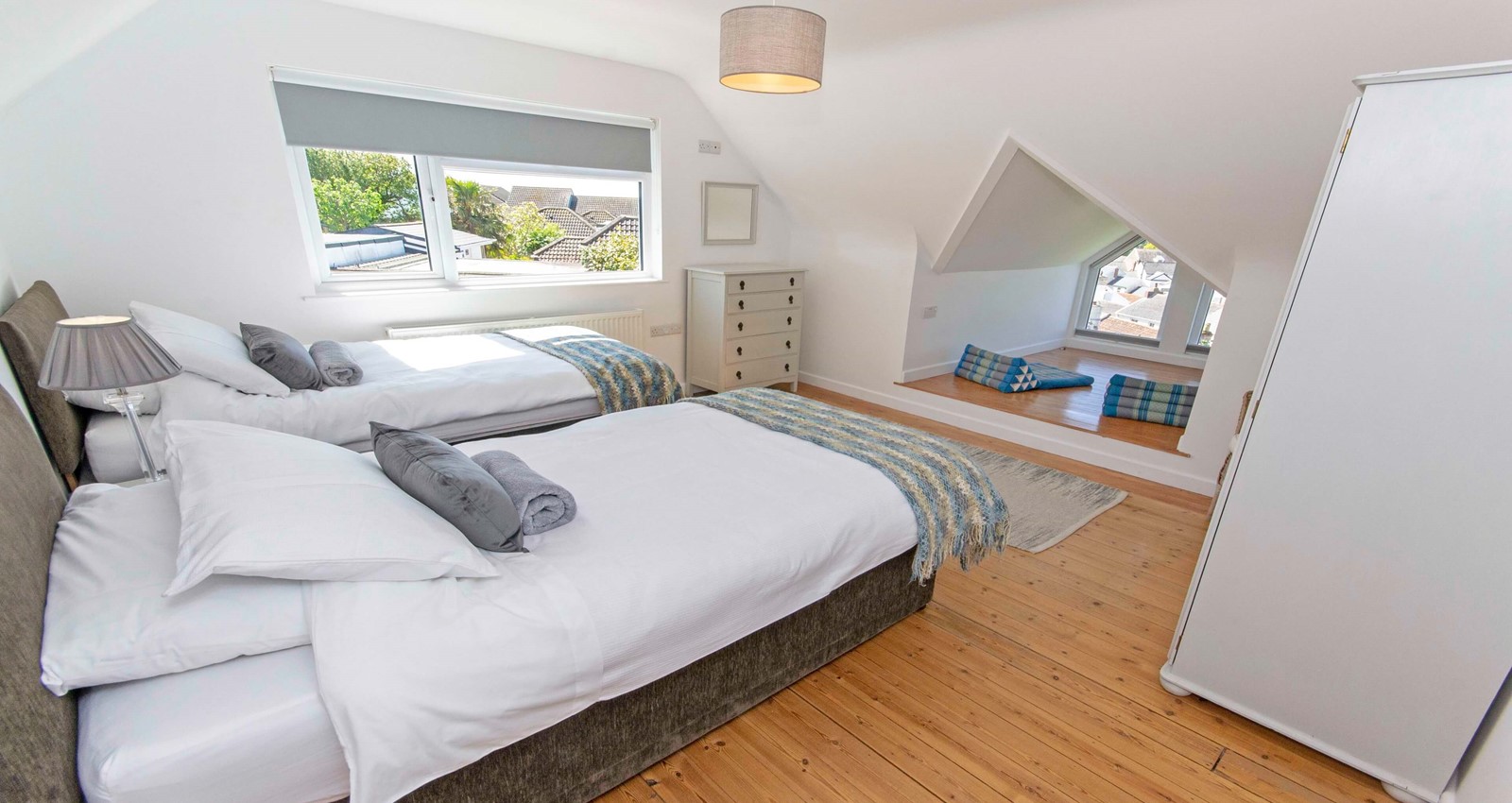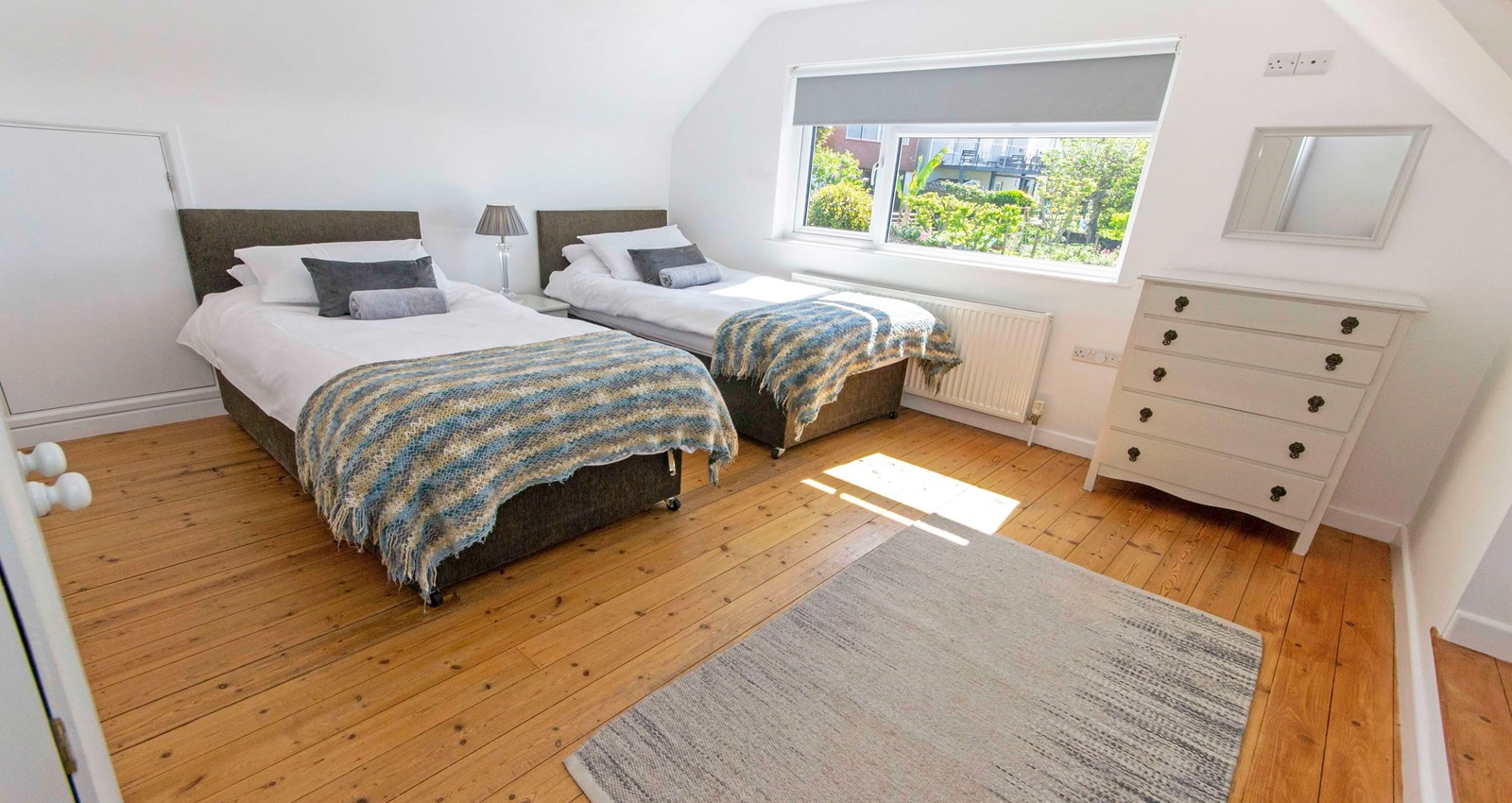 Bedroom Three: Twin zip and link beds (can be made into a superking on request), bedside table, wardrobe, chest of drawers, mirror, and a chair. Enjoy stunning elevated views of Braunton through the apex glass window.