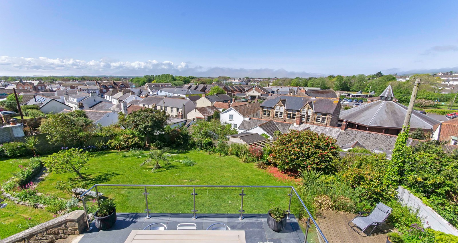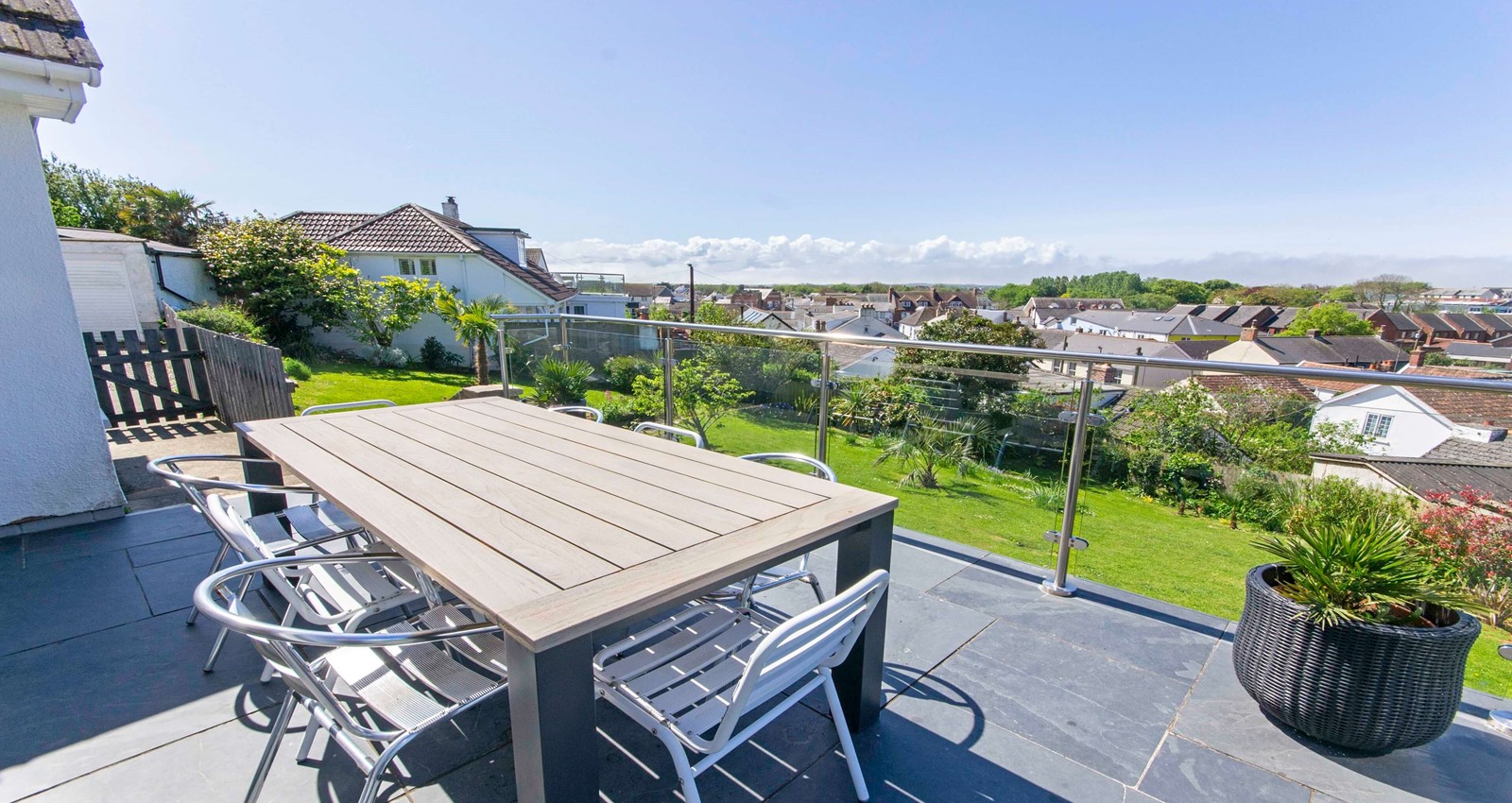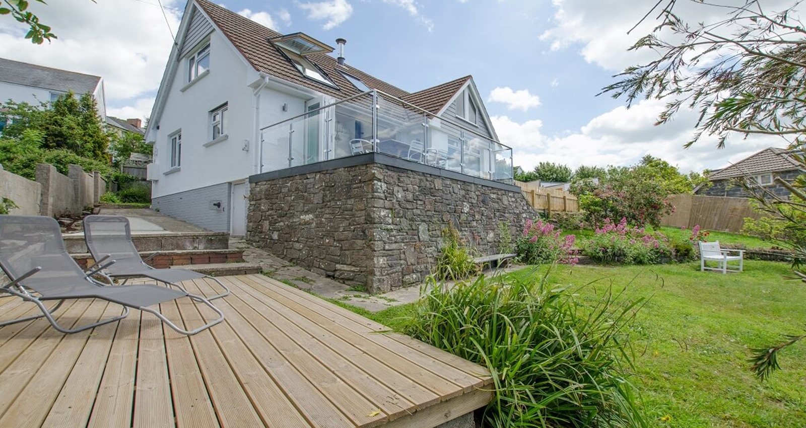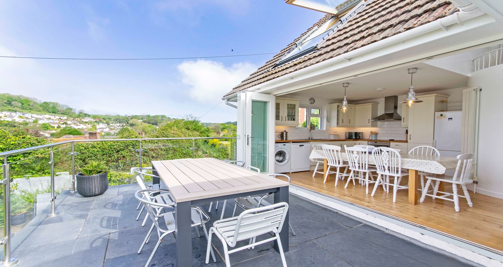 Bifold doors from the dining area lead onto a slate terrace enclosed with a glass wall and furnished with a large outdoor table and chairs. Steps descend to a wraparound sloped garden that's fully enclosed with mature shrubs, plum and pear trees, and a lawned area. Adjacent to the lawn is a decked space perfect for catching the final evening sun. Enjoy relaxed evenings with the coal Weber BBQ, soaking in views across to the twinkling lights of Appledore and Instow. Additional features include a quiet patio, outdoor shower, and private parking for three cars.