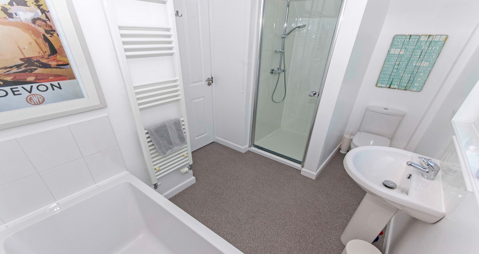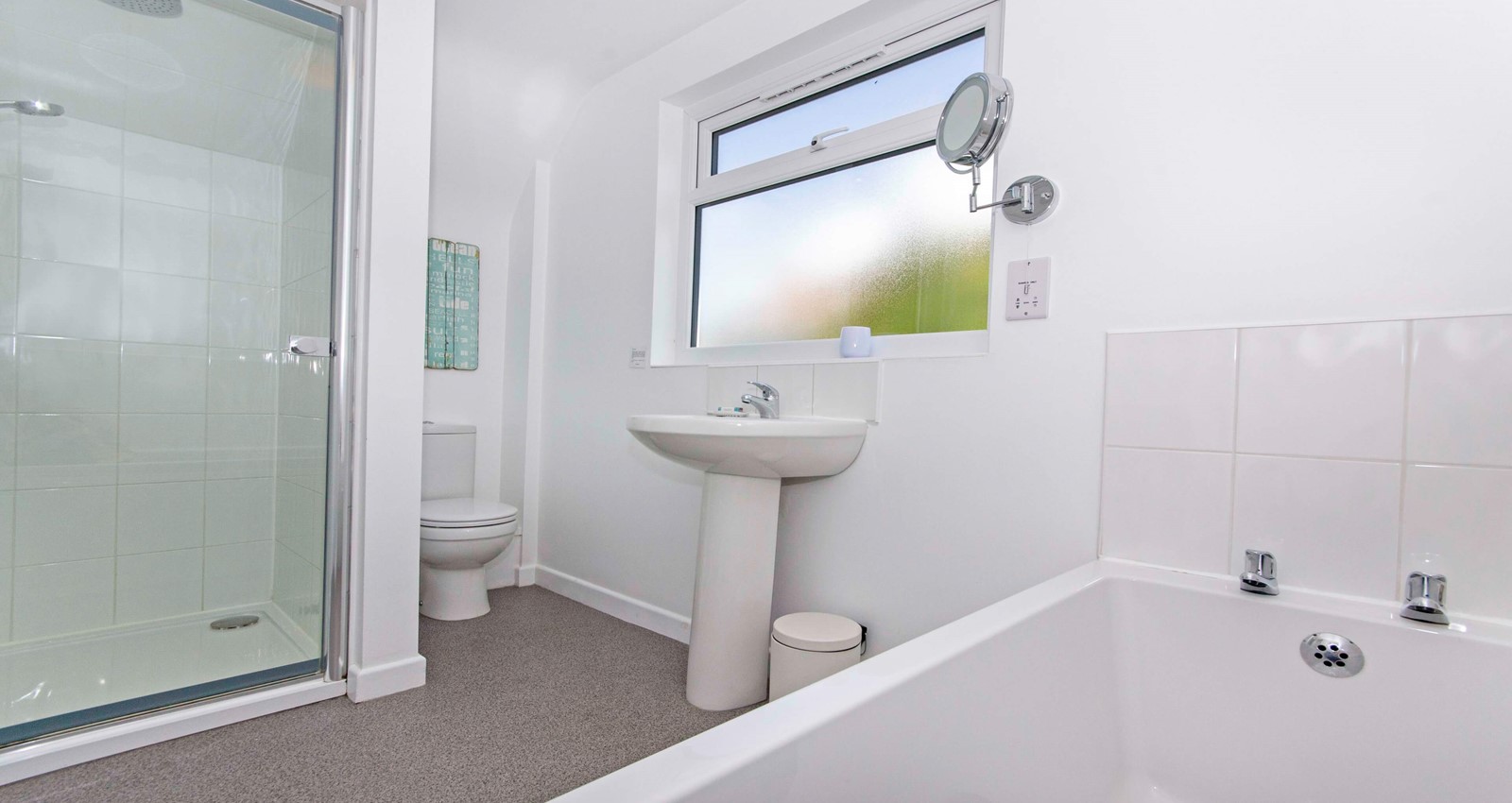 Bath, separate shower with dual soaker, W.C, washbasin with mirror