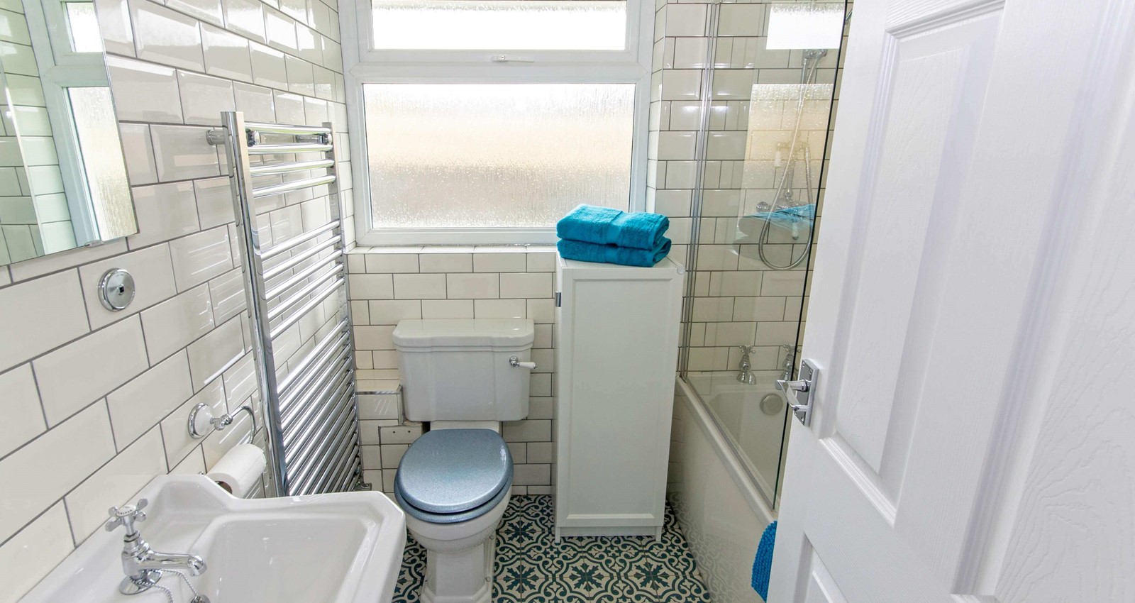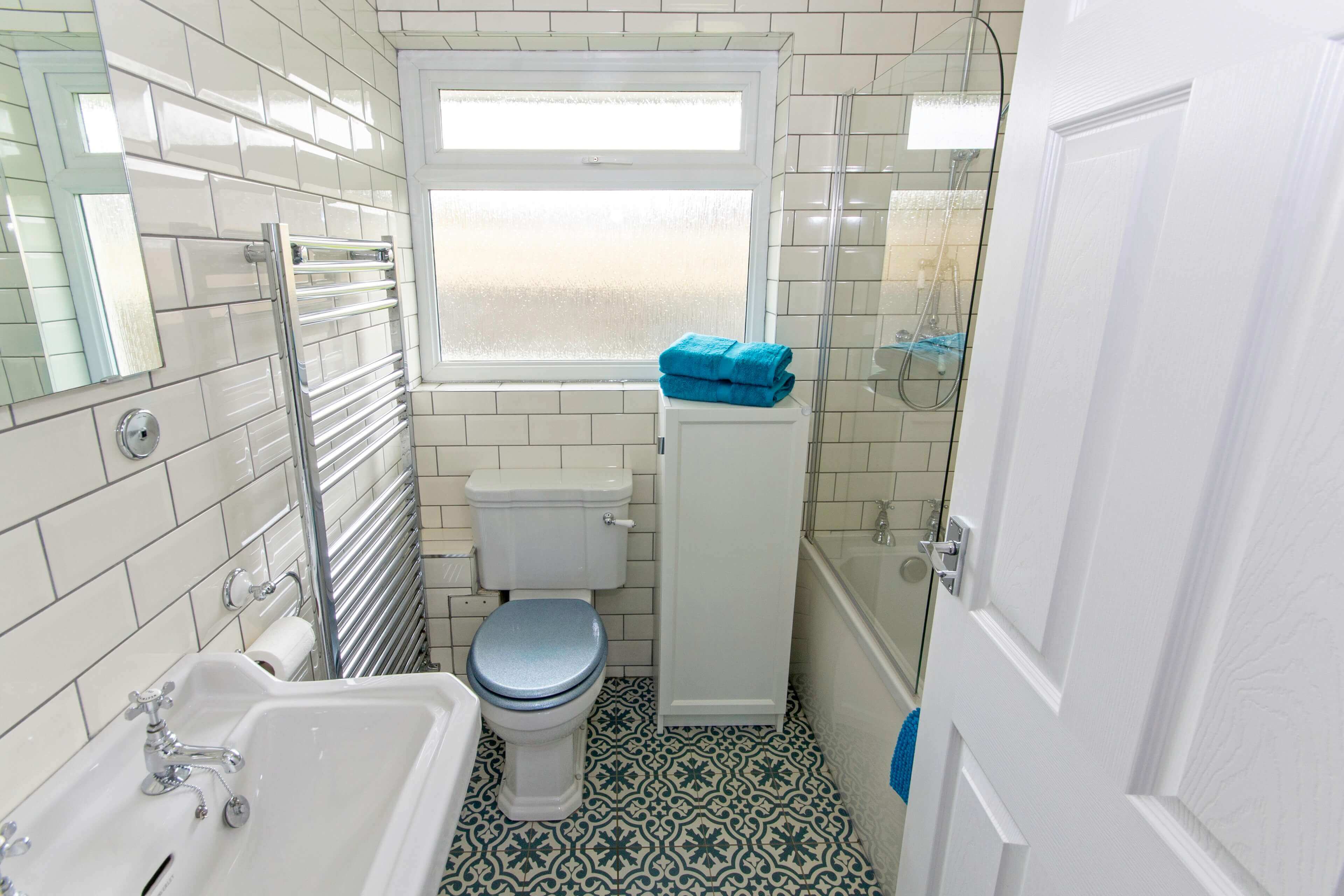 Family Bathroom: W.C, washbasin, bath with overhead rain shower and hose attachment.