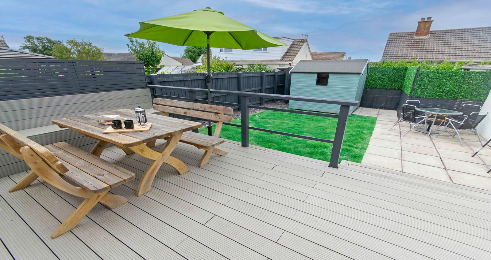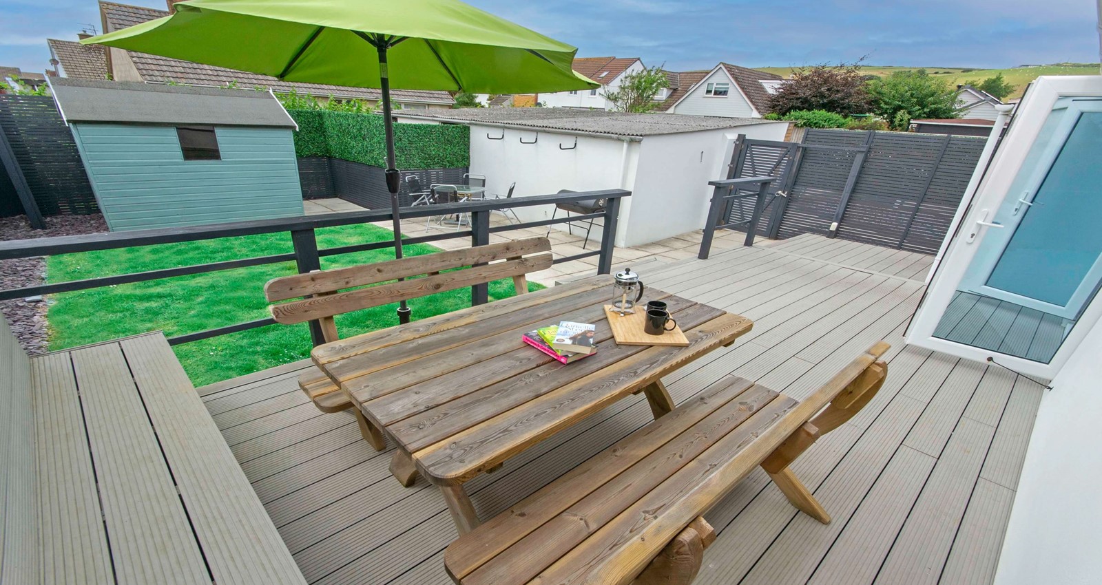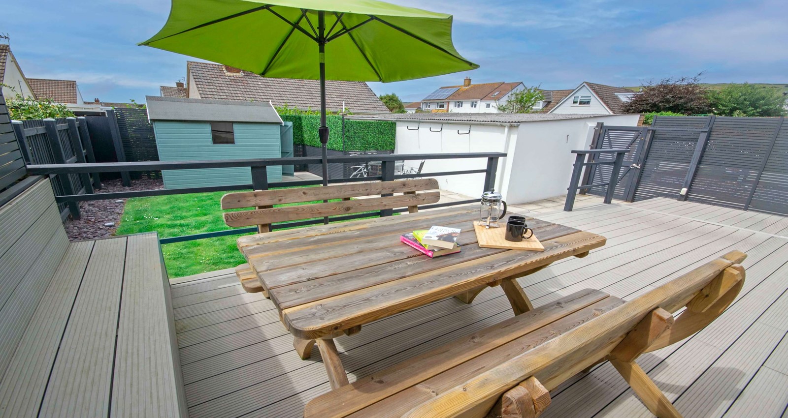 French patio doors from the lounge open onto a private decking area. The fully enclosed garden is laid to lawn and includes patio furniture, a BBQ, and a storage shed-perfect for surfboards and beach gear, there is also driveway parking.