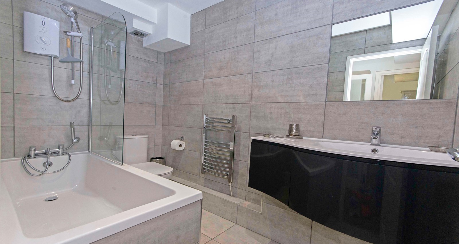 Family bathroom with a modern white suite including a bath with shower over, wc and washbasin.