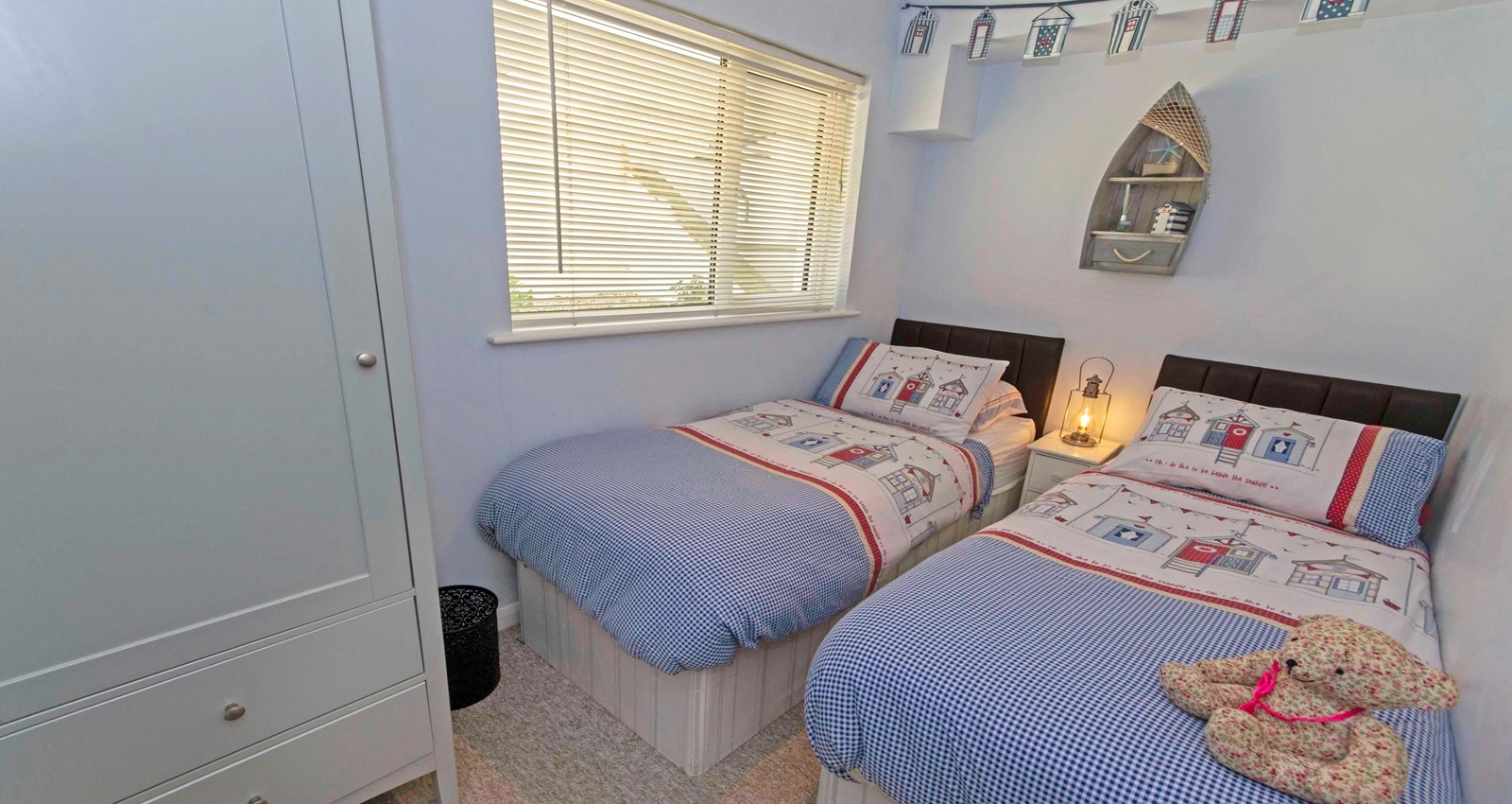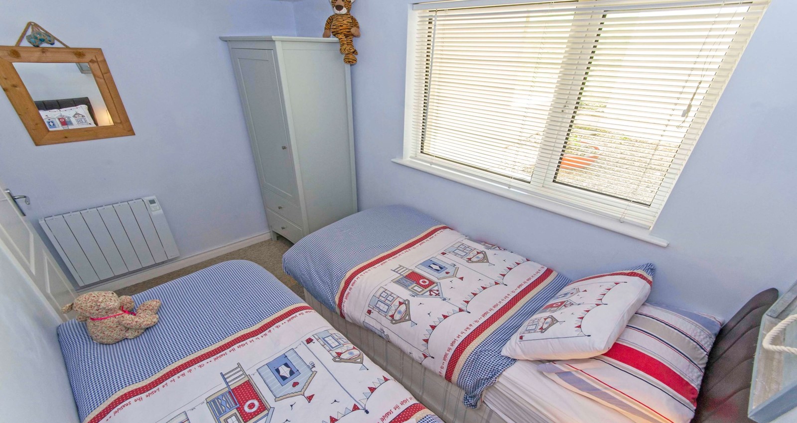 - Bedroom two - Slimline twin beds, bedside table, a slimline wardrobe and mirror.