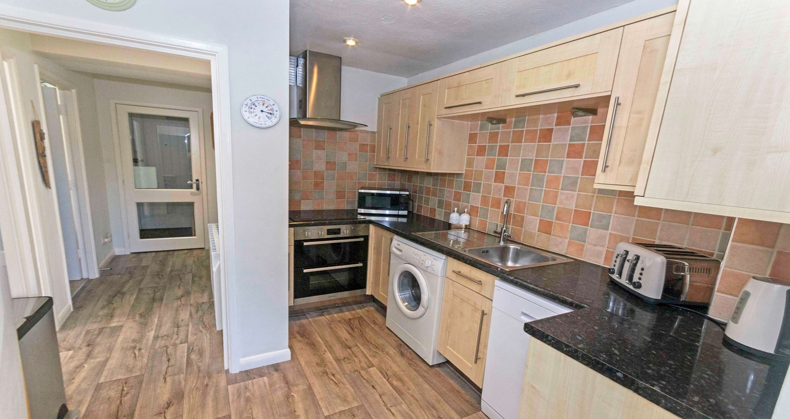 Kitchen with chrome accessories, black flecked surface and colourful splashbacks. Equipped with essential utensils, crockery and additions like; cafetiere, tea pot and even egg cups! Appliances include; Tall fridge/freezer, oven, hob, microwave, toaster, dishwasher and washing machine. Tumble dryer is available in the complex utility.
