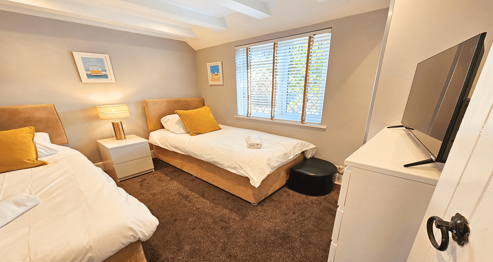 - Bedroom Two - two single beds, bedside table, wardrobe, chest of drawers, and Freeview LCD TV.