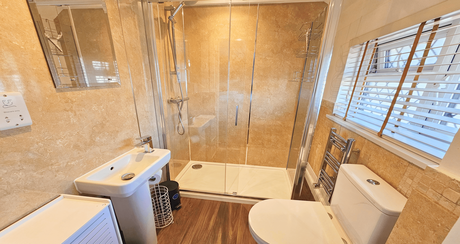 Bright and sociable, this open-plan space brings everyone together in one stylish setting. At one end, a comfy lounge area features seating and a wall-mounted Freeview LCD TV - ideal for cosy evenings. The dining table comfortably seats four for mealtimes, while the sleek kitchen is fully equipped with a cooker, hob, freestanding fridge freezer, dishwasher, washing machine, microwave, kettle, toaster, coffee machine, and a breakfast bar with seating for two.