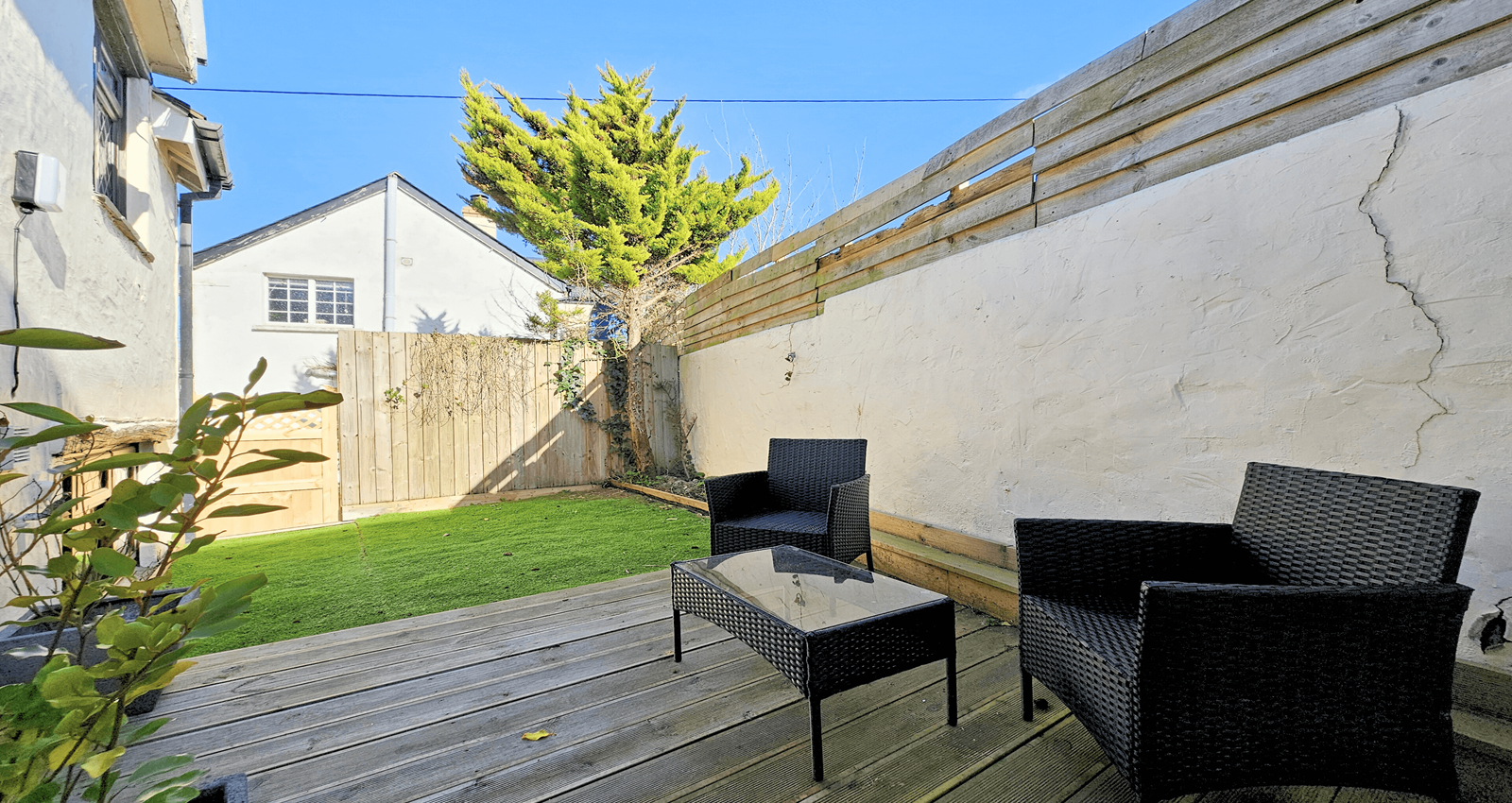 Step outside to a fully enclosed rear garden featuring decking, astro turf, and comfortable garden furniture - a sunny and private spot for alfresco dining or unwinding with a drink after a day at the beach.