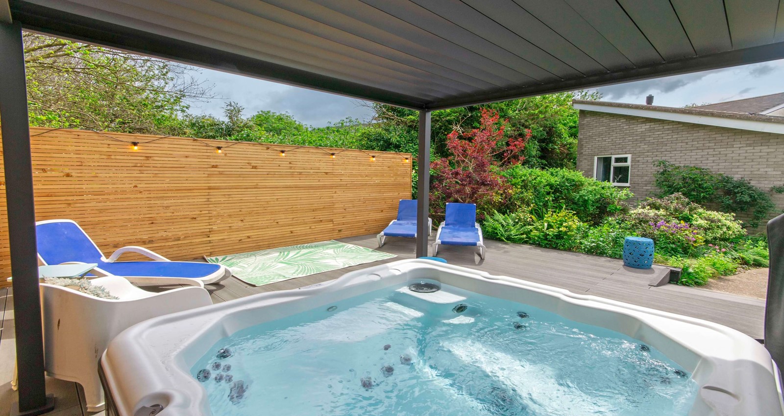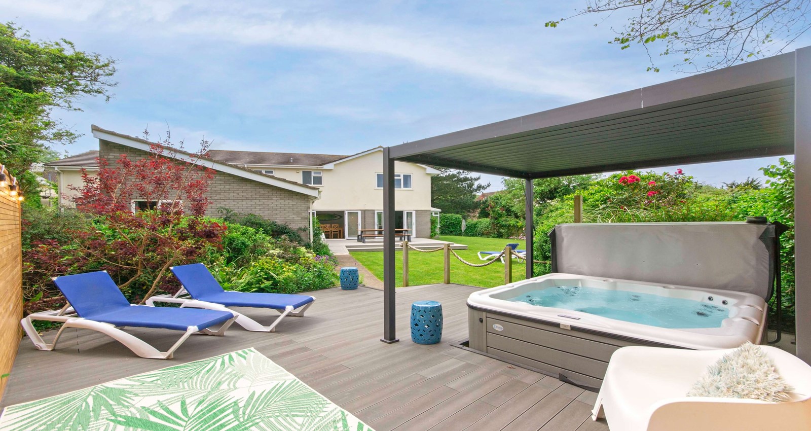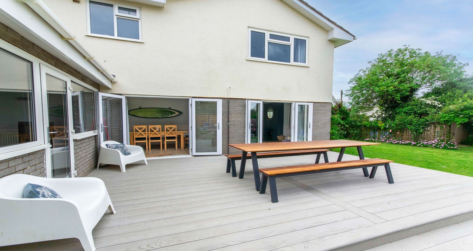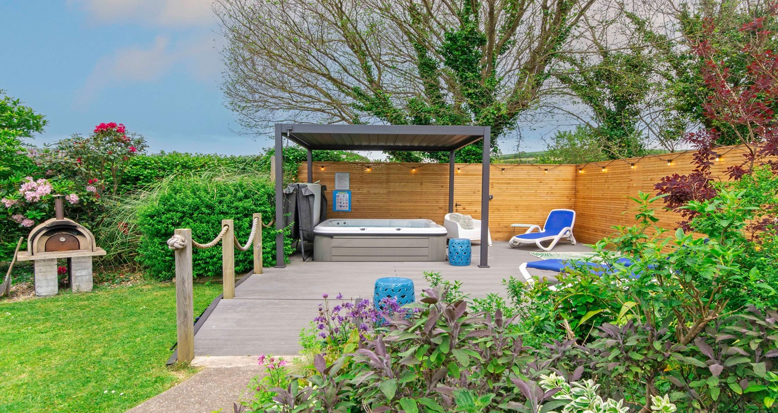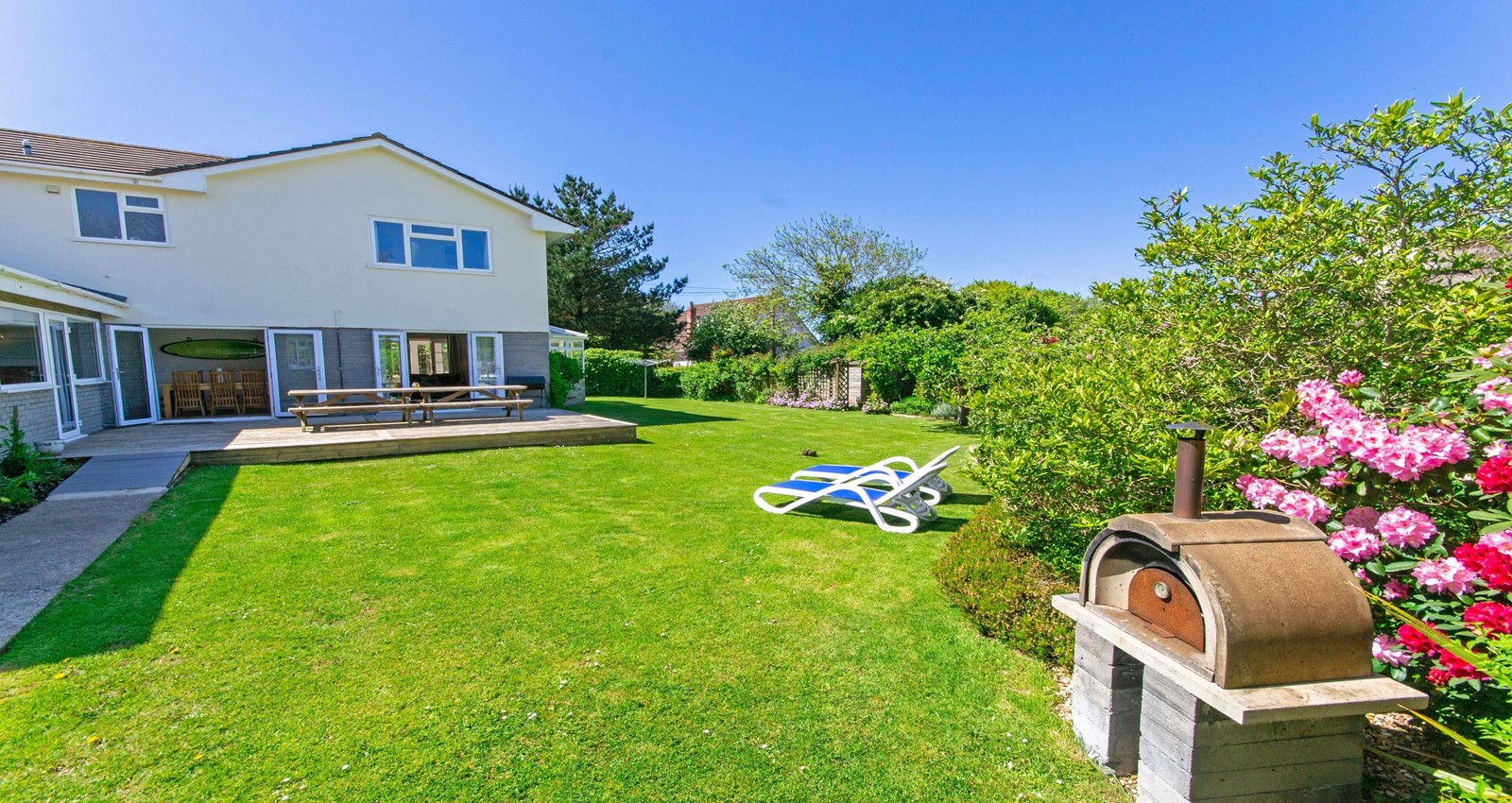 A large enclosed lawn wraps around the side of the property, bordered by well-maintained shrubs and colourful flower beds. Two raised decked terraces provide ideal spots for al fresco dining, with a selection of tables, chairs, and sun loungers. A built-in BBQ and impressive brick pizza oven invite outdoor cooking adventures. After beach days, rinse off under the convenient outside shower, with ample storage nearby for boards and bikes. For slower afternoons, soak in the 6-seater Jacuzzi hot tub* under the open sky.