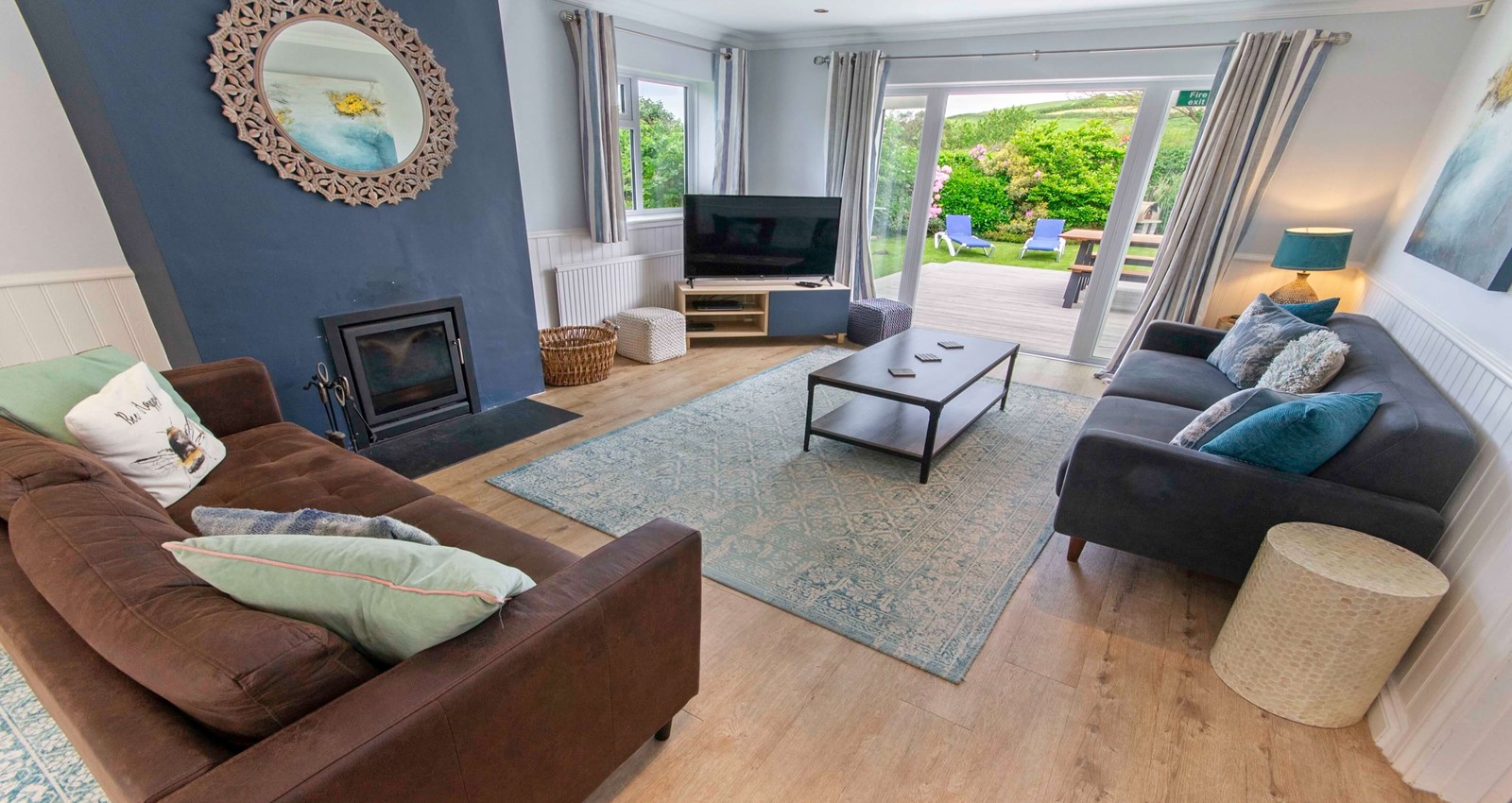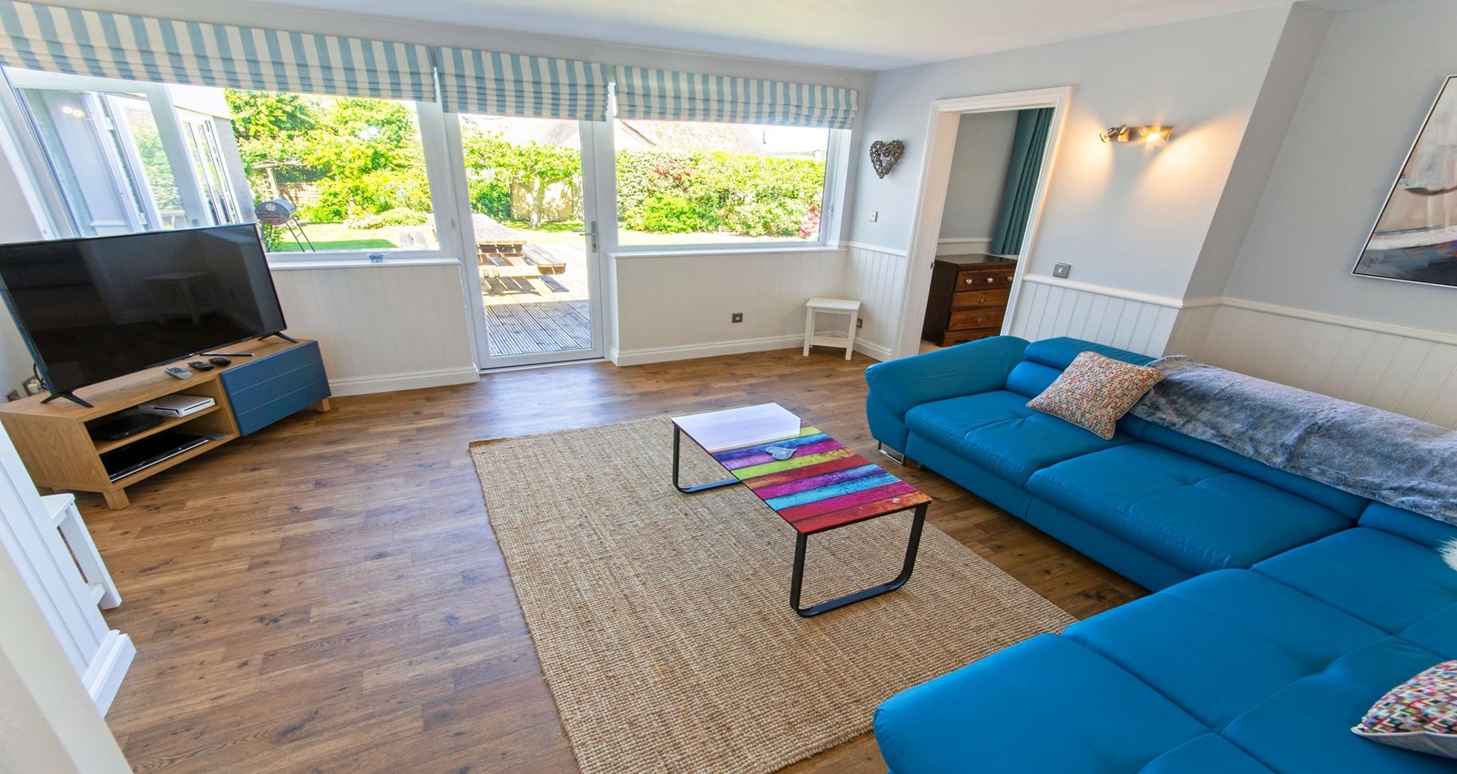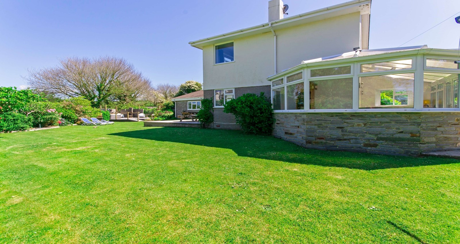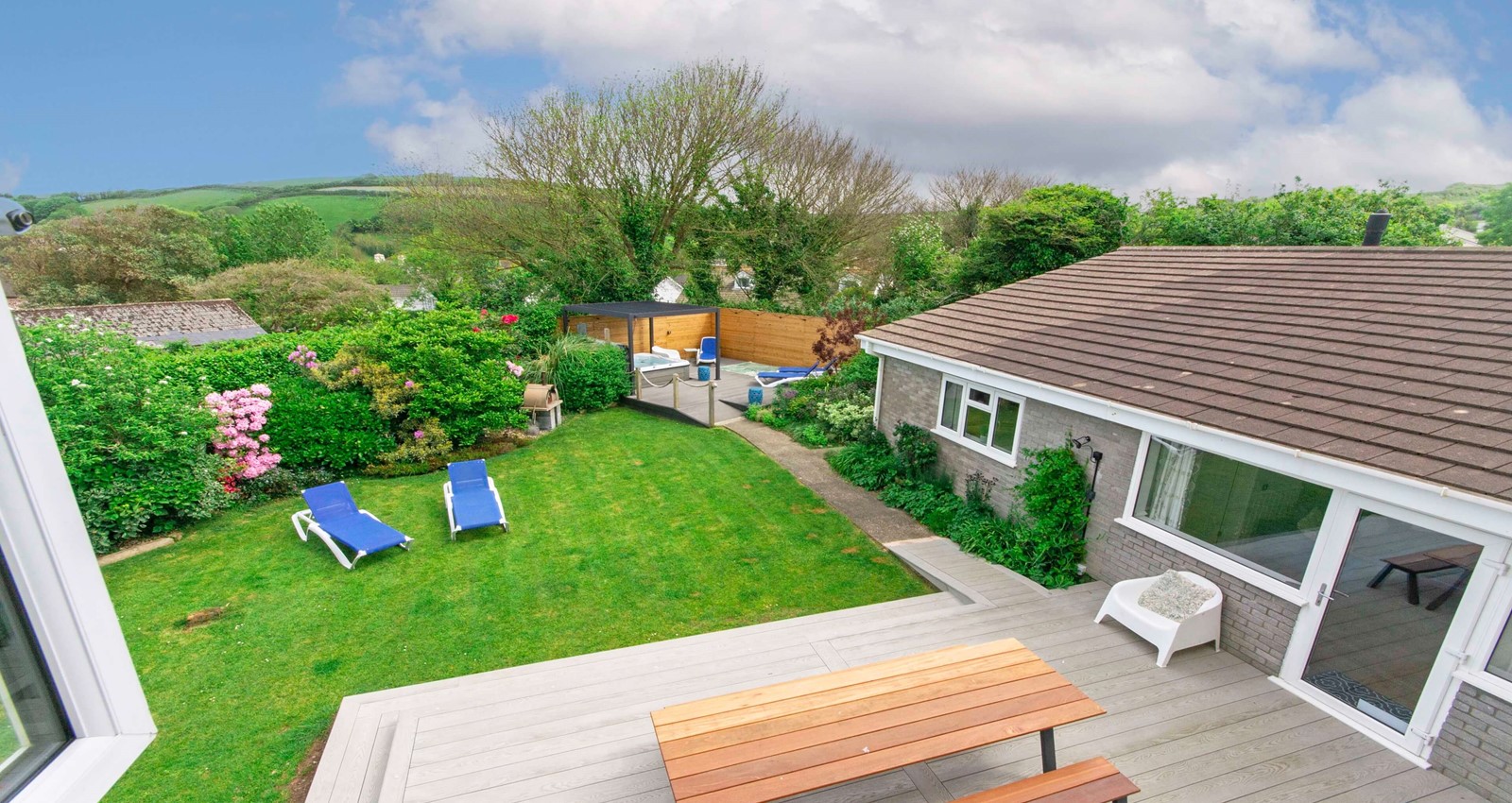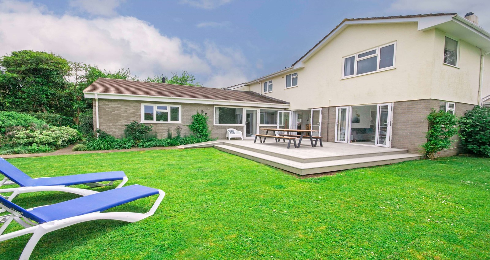 A large enclosed lawn wraps around the side of the property, bordered by well-maintained shrubs and colourful flower beds. Two raised decked terraces provide ideal spots for al fresco dining, with a selection of tables, chairs, and sun loungers. A built-in BBQ and impressive brick pizza oven invite outdoor cooking adventures. After beach days, rinse off under the convenient outside shower, with ample storage nearby for boards and bikes. For slower afternoons, soak in the 6-seater Jacuzzi hot tub* under the open sky.