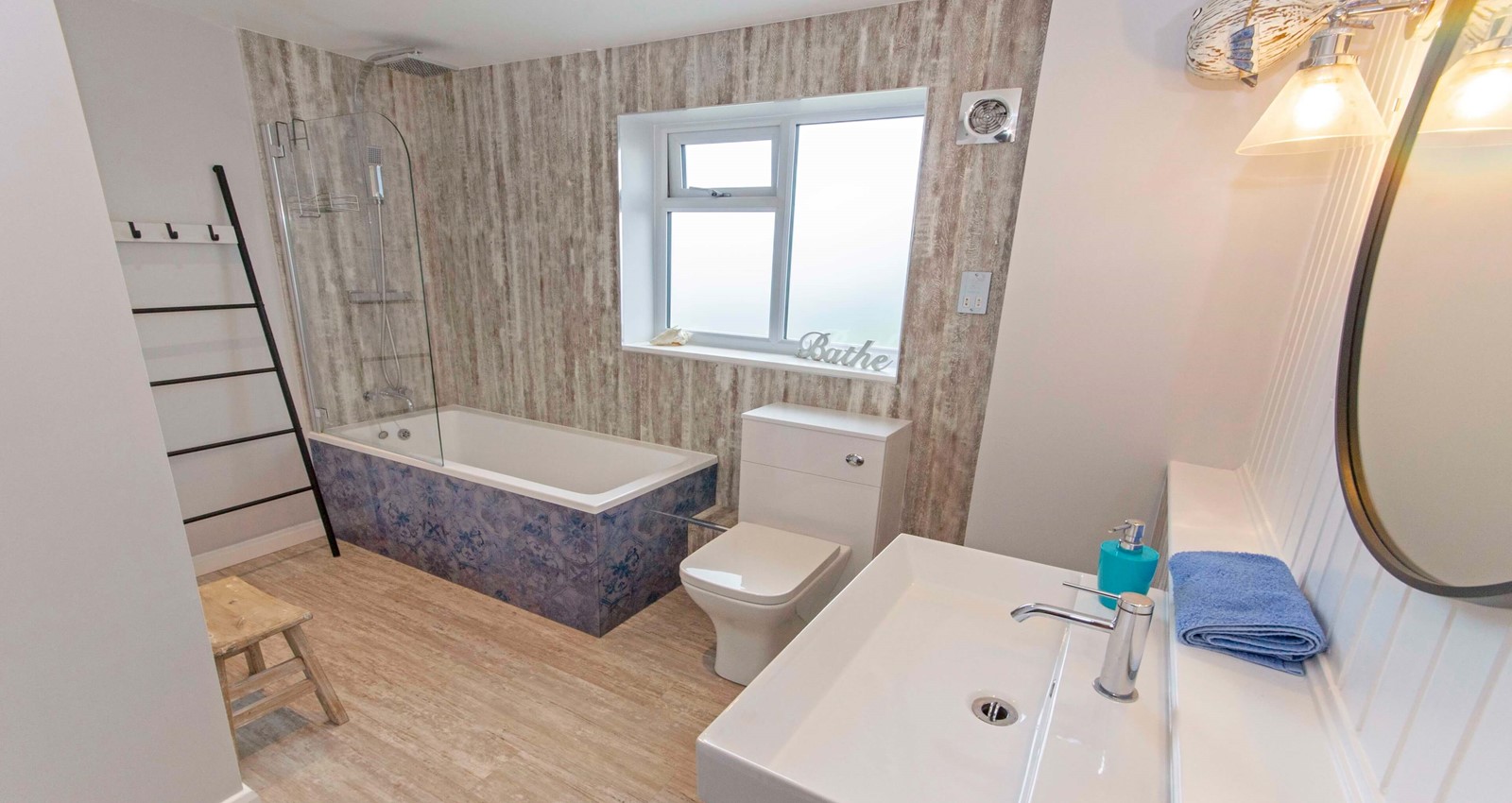 Family Bathroom: Bath with shower over, W.C, washbasin, heated towel rail, and mirror