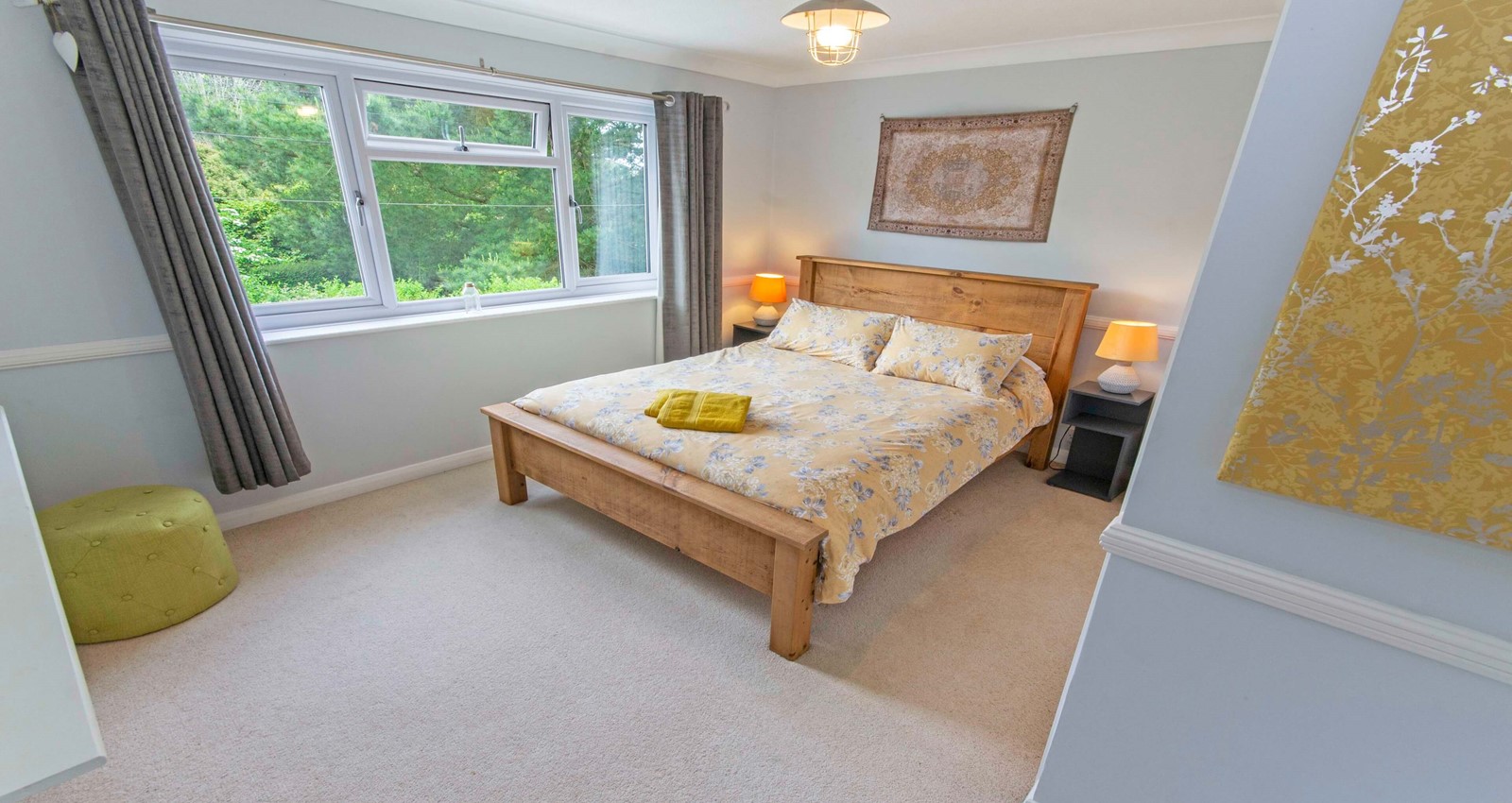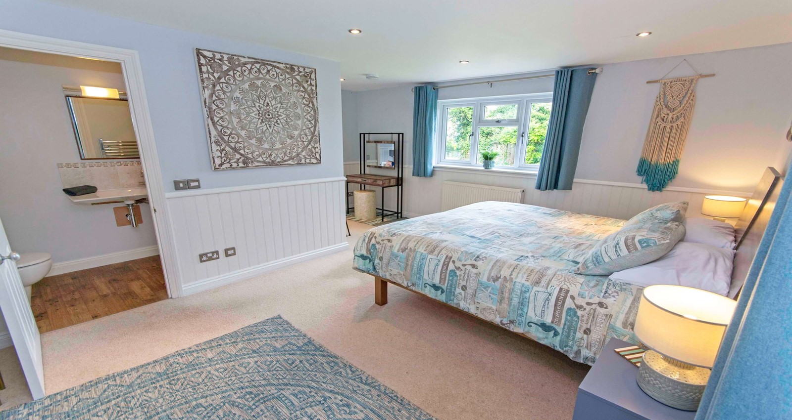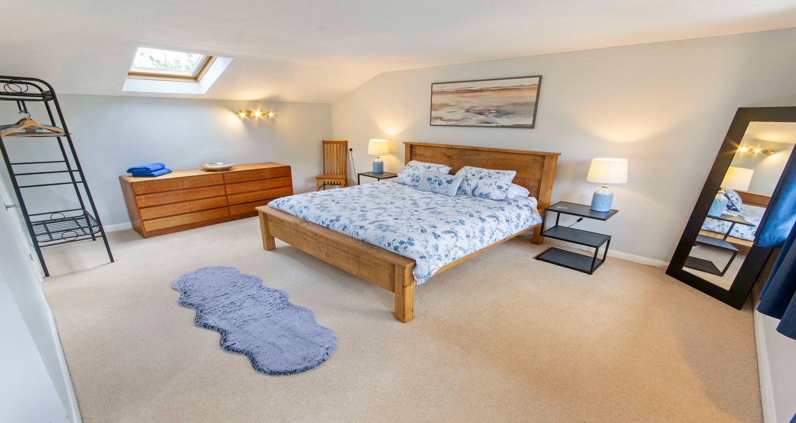 Bedroom Two: King size bed, bedside tables, built-in wardrobe, countryside views