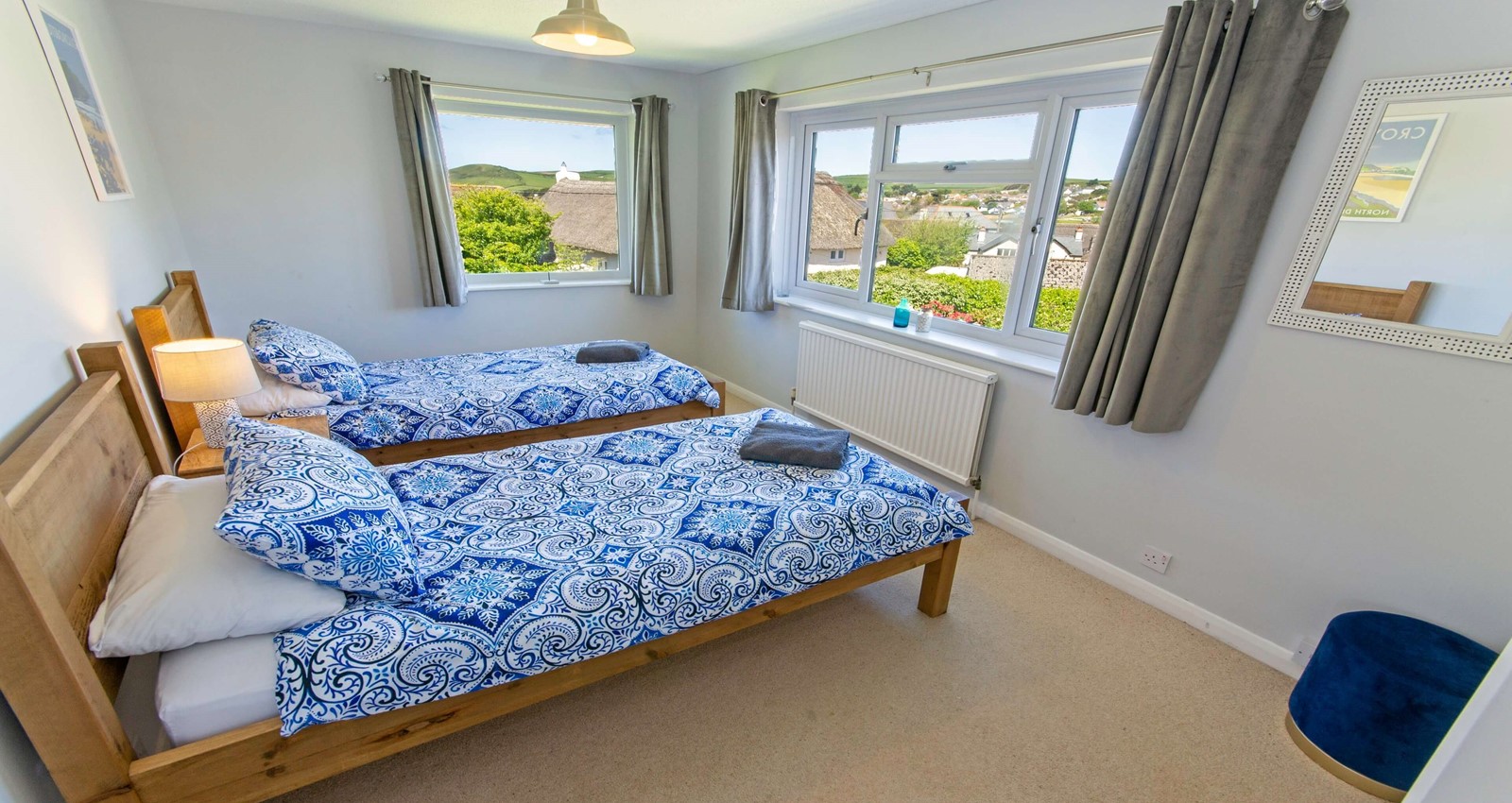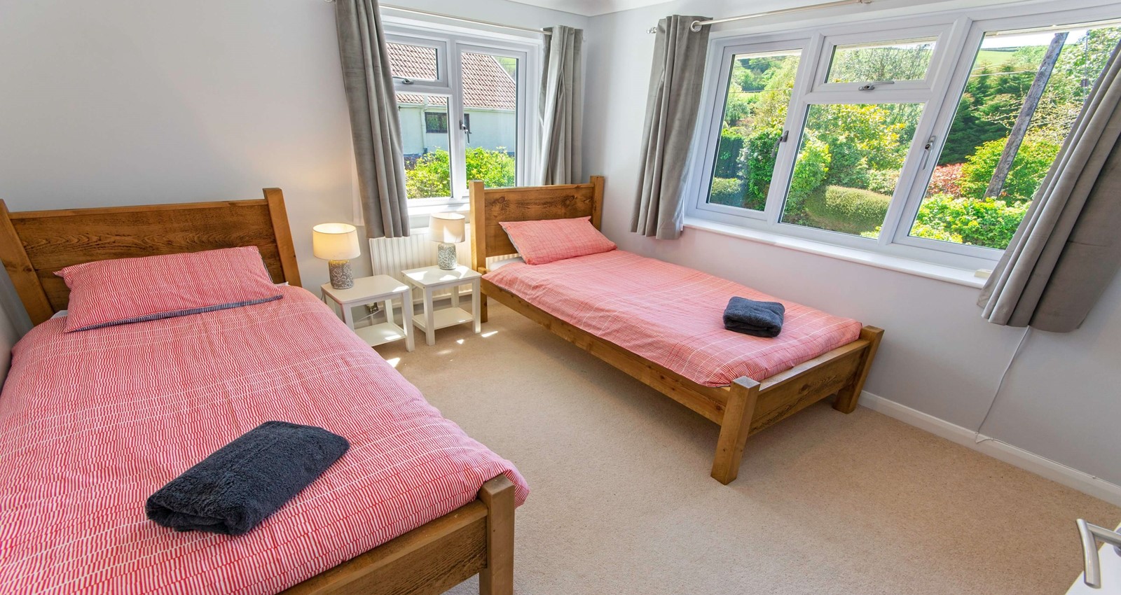 Bedroom Three: Twin beds, bedside unit, built-in wardrobe