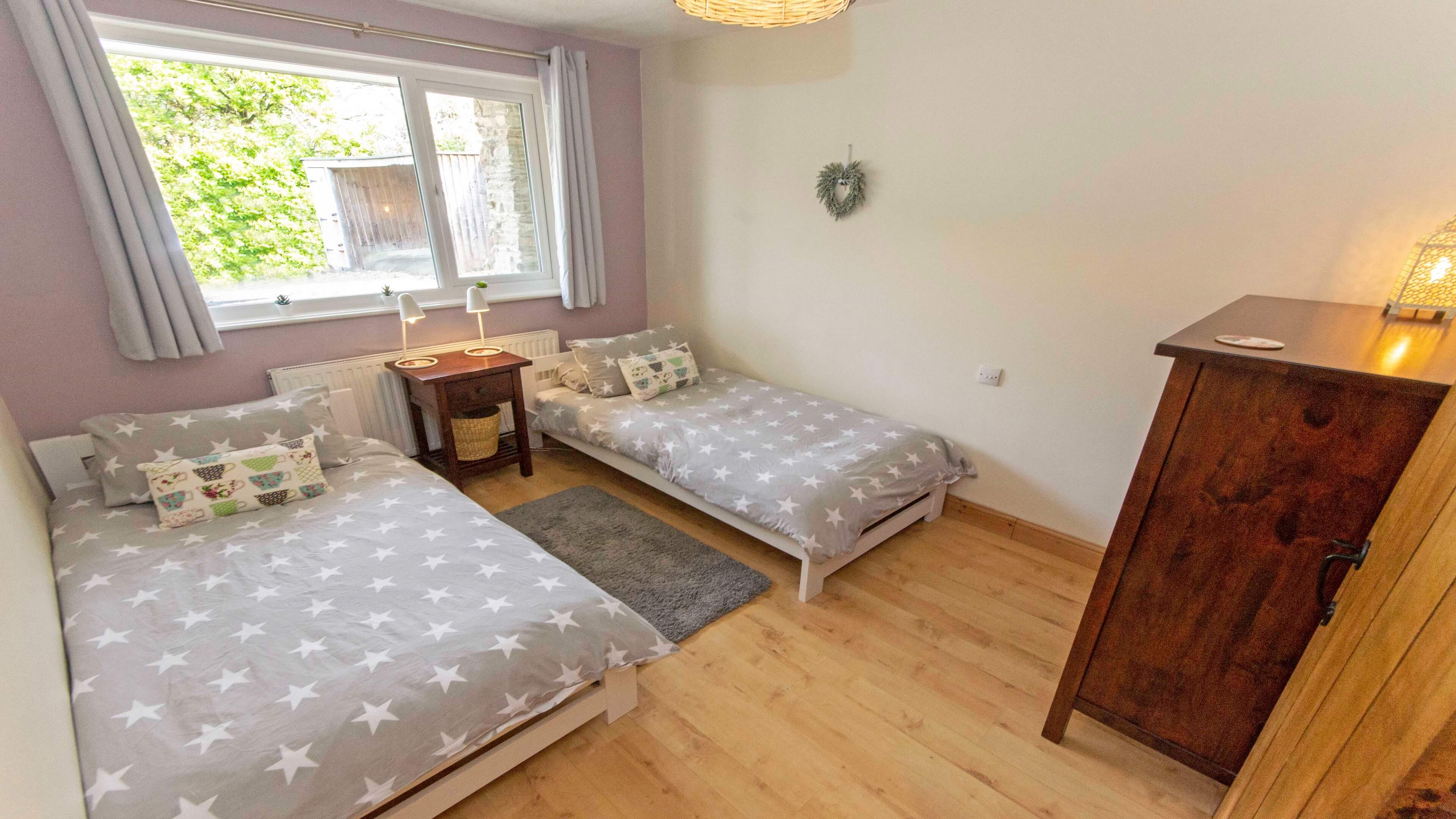 Bedroom Three: Twin beds, bedside table, and chest of drawers
