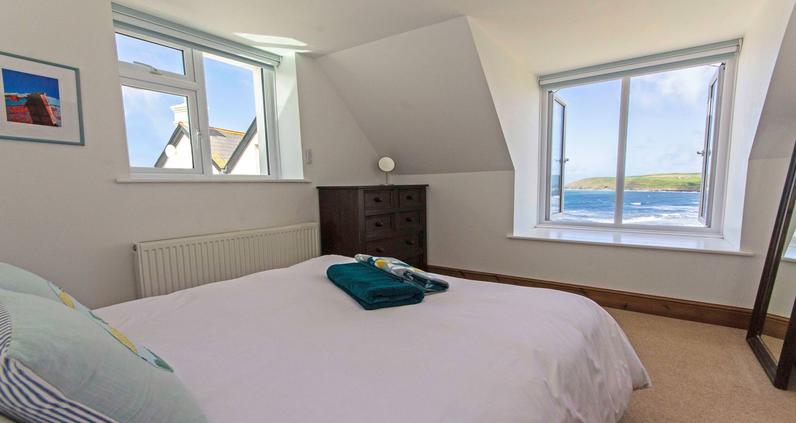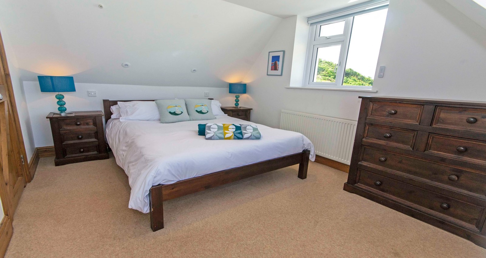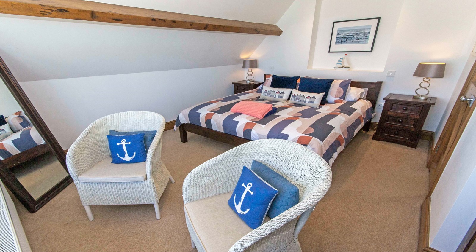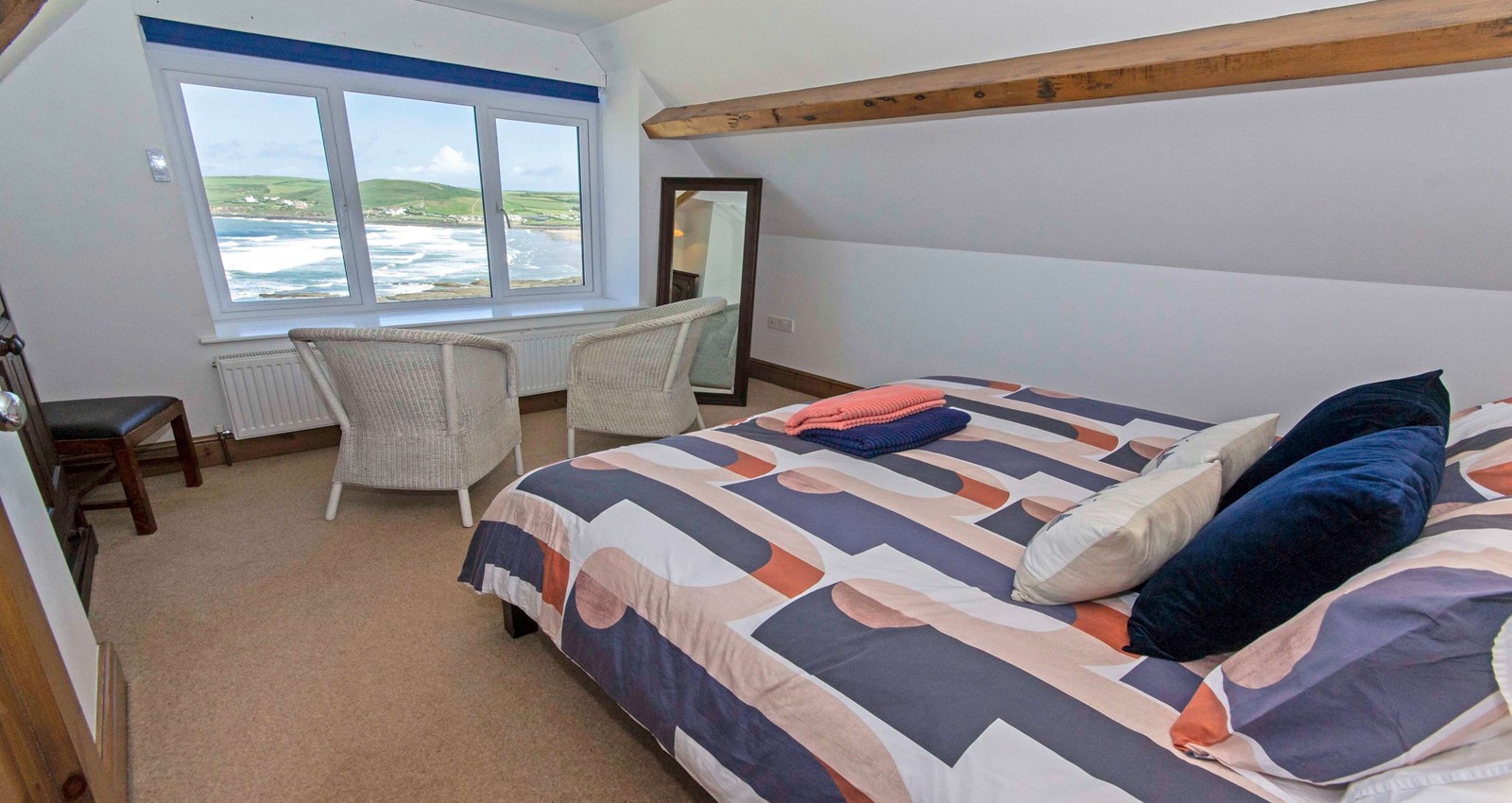 Master Bedroom: Superking bed with stunning beach views, bedside tables, small wardrobe, full-length mirror, and two tub chairs to enjoy the scenery