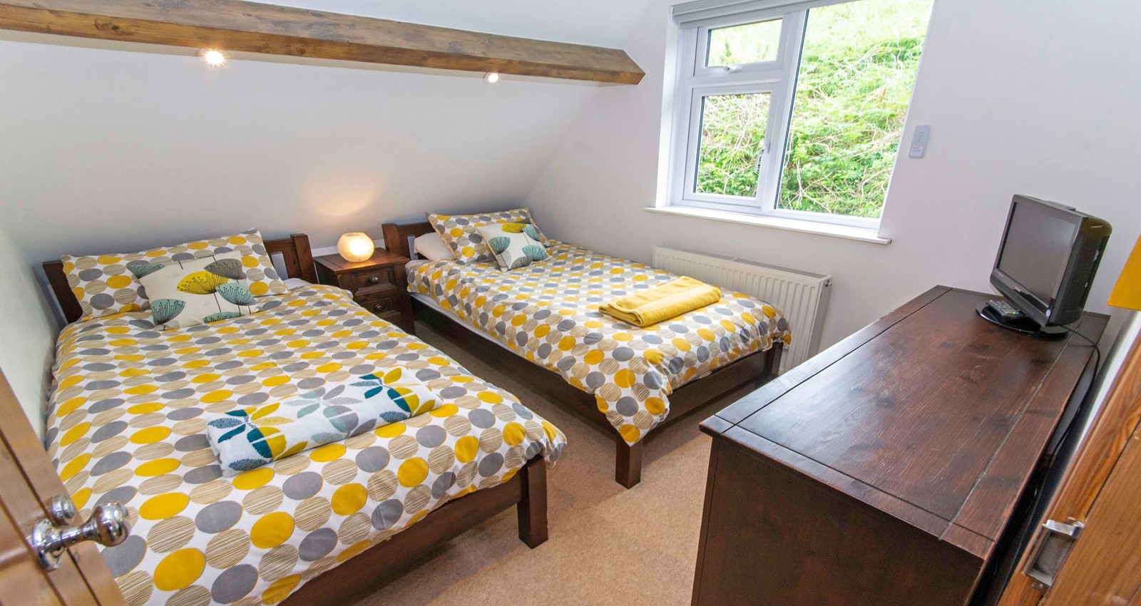 Bedroom Three: Twin beds, chest of drawers with TV, and bedside unit