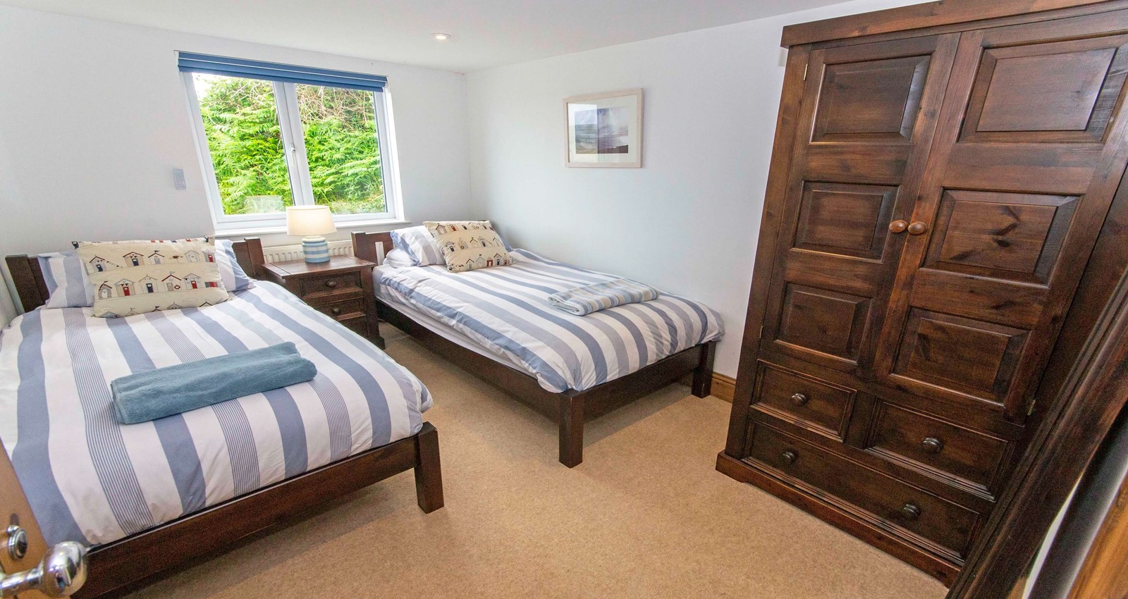Bedroom Four: Twin beds, freestanding full-length mirror, bedside table, and wooden wardrobe.
