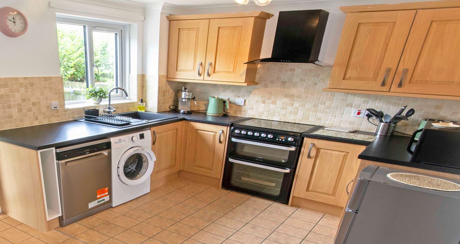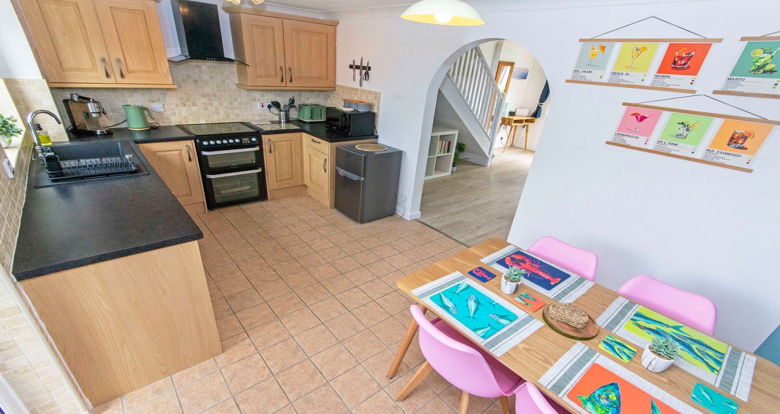 A spacious kitchen diner featuring a modern, well-equipped kitchen at one end and a large dining table at the other. You'll find everything you need for a comfortable self-catering stay, including an electric oven and hob, standalone fridge freezer, dishwasher, washing machine, toaster, kettle, and coffee machine, along with a full range of essential utensils. A back door opens onto the enclosed courtyard garden - perfect for enjoying meals or relaxing outdoors.