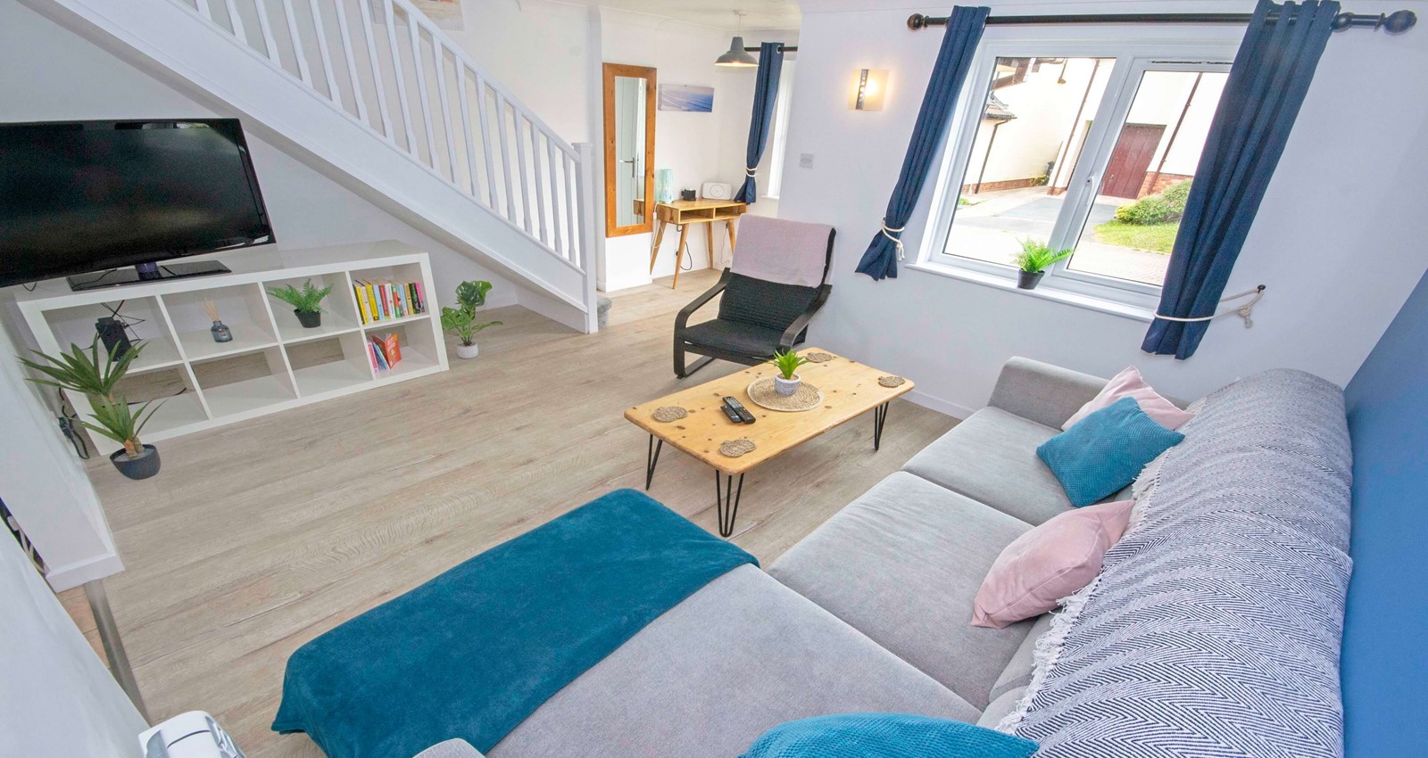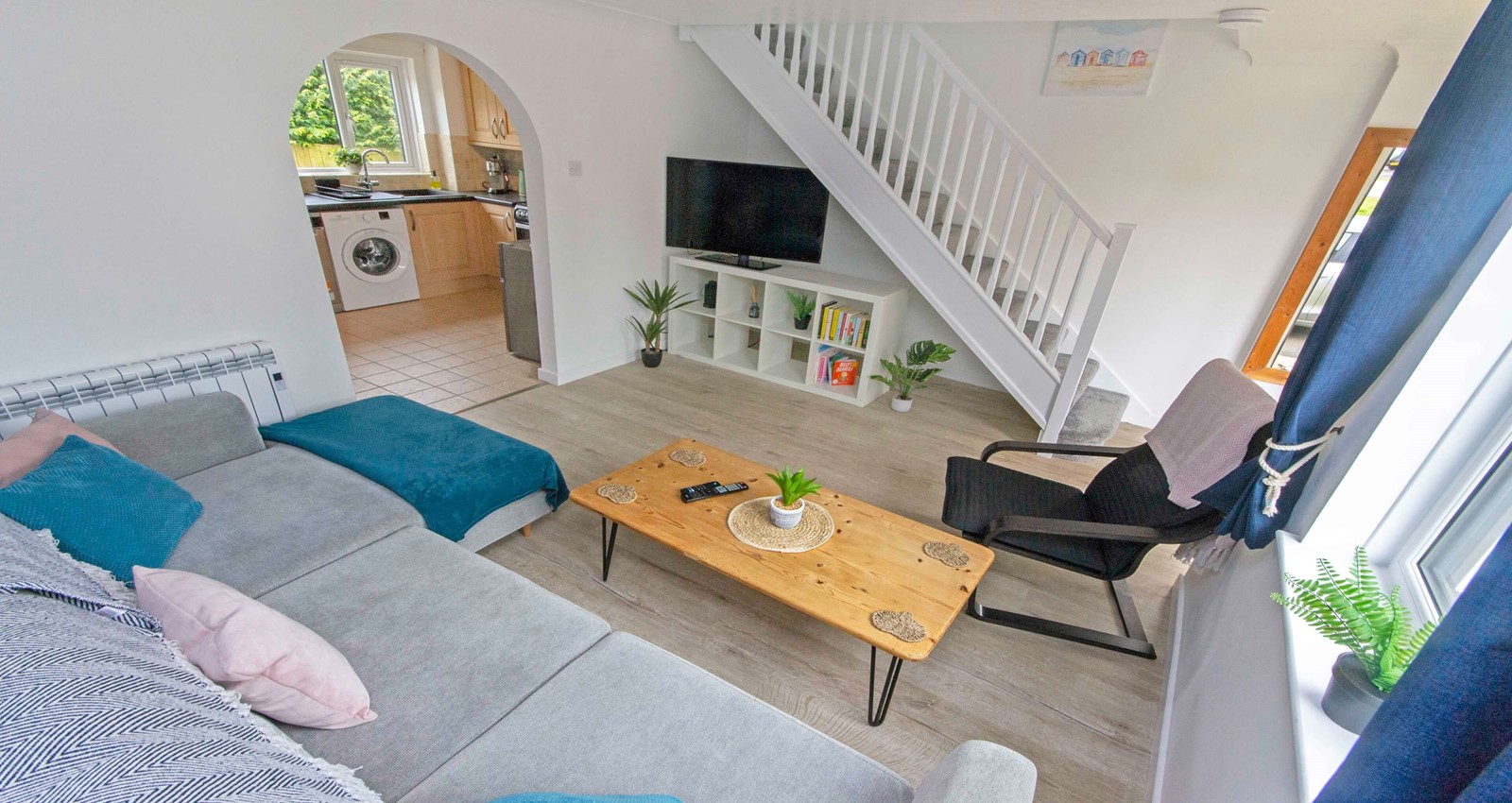 A bright and airy open-plan lounge featuring a corner sofa, coffee table, and a freestanding Smart LCD TV