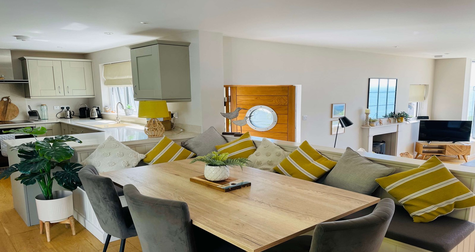 Open plan L shaped living and dining space with fantastic seaviews overlooking Grunta beach, 2 comfortable sofas, LCD TV and fireplace. Kitchen and dining area with modern shaker units, built in appliances to include; dishwasher, coffee machine, fridge, freezer, electric hob and oven. Dining seating area for six with large patio doors that lead onto the lower decking area.